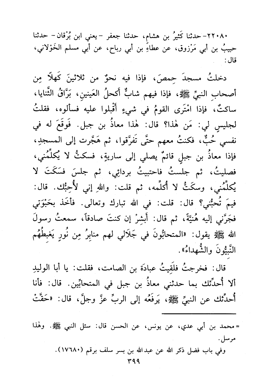 ٢٢٠٨٠ - حَدَّثَنَا كَثِيرُ بْنُ هِشَامٍ، حَدَّثَنَا جَعْفَرٌ يَعْنِي ابْنَ بُرْقَانَ، حَدَّثَنَا حَبِيبُ بْنُ أَبِي مَرْزُوقٍ، عَنْ عَطَاءِ بْنِ أَبِي رَبَاحٍ، عَنْ أَبِي مُسْلِمٍ الْخَوْلَانِيِّ قَالَ: دَخَلْتُ مَسْجِدَ حِمْصَ فَإِذَا فِيهِ نَحْوٌ مِنْ ثَلَاثِينَ كَهْلًا مِنْ أَصْحَابِ النَّبِيِّ صَلَّى اللهُ عَلَيْهِ وَسَلَّمَ، فَإِذَا فِيهِمْ شَابٌّ أَكْحَلُ الْعَيْنَيْنِ، بَرَّاقُ الثَّنَايَا سَاكِتٌ، فَإِذَا امْتَرَى الْقَوْمُ فِي شَيْءٍ أَقْبَلُوا عَلَيْهِ فَسَأَلُوهُ. فَقُلْتُ: لِجَلِيسٍ لِي مَنْ هَذَا؟ قَالَ: هَذَا مُعَاذُ بْنُ جَبَلٍ فَوَقَعَ لَهُ فِي نَفْسِي حُبٌّ، فَكُنْتُ مَعَهُمْ حَتَّى تَفَرَّقُوا، ثُمَّ هَجَّرْتُ إِلَى الْمَسْجِدِ، فَإِذَا مُعَاذُ بْنُ جَبَلٍ قَائِمٌ يُصَلِّي إِلَى سَارِيَةٍ، فَسَكَتَ لَا يُكَلِّمُنِي فَصَلَّيْتُ، ثُمَّ جَلَسْتُ فَاحْتَبَيْتُ بِرِدَائِي، ثُمَّ جَلَسَ فَسَكَتَ لَا يُكَلِّمُنِي، وَسَكَتُّ لَا أُكَلِّمُهُ، ثُمَّ قُلْتُ: وَاللهِ إِنِّي لَأُحِبُّكَ. قَالَ: فِيمَ تُحِبُّنِي؟ قَالَ: قُلْتُ: فِي اللهِ تَبَارَكَ وَتَعَالَى فَأَخَذَ بِحُبْوَتِي فَجَرَّنِي إِلَيْهِ هُنَيَّةً، ثُمَّ قَالَ: أَبْشِرْ إِنْ كُنْتَ صَادِقًا سَمِعْتُ رَسُولَ اللهِ صَلَّى اللهُ عَلَيْهِ وَسَلَّمَ يَقُولُ: " الْمُتَحَابُّونَ فِي جَلَالِي لَهُمْ مَنَابِرُ مِنْ نُورٍ يَغْبِطُهُمُ النَّبِيُّونَ وَالشُّهَدَاءُ ". ١٠ قَالَ: فَخَرَجْتُ فَلَقِيتُ عُبَادَةَ بْنَ الصَّامِتِ فَقُلْتُ: يَا أَبَا الْوَلِيدِ لَا أُحَدِّثُكَ بِمَا حَدَّثَنِي مُعَاذُ بْنُ جَبَلٍ فِي الْمُتَحَابِّينَ. قَالَ: فَأَنَا أُحَدِّثُكَ عَنِ النَّبِيِّ صَلَّى اللهُ عَلَيْهِ وَسَلَّمَ يَرْفَعُهُ إِلَى الرَّبِّ عَزَّ وَجَلَّ قَالَ: " حَقَّتْ