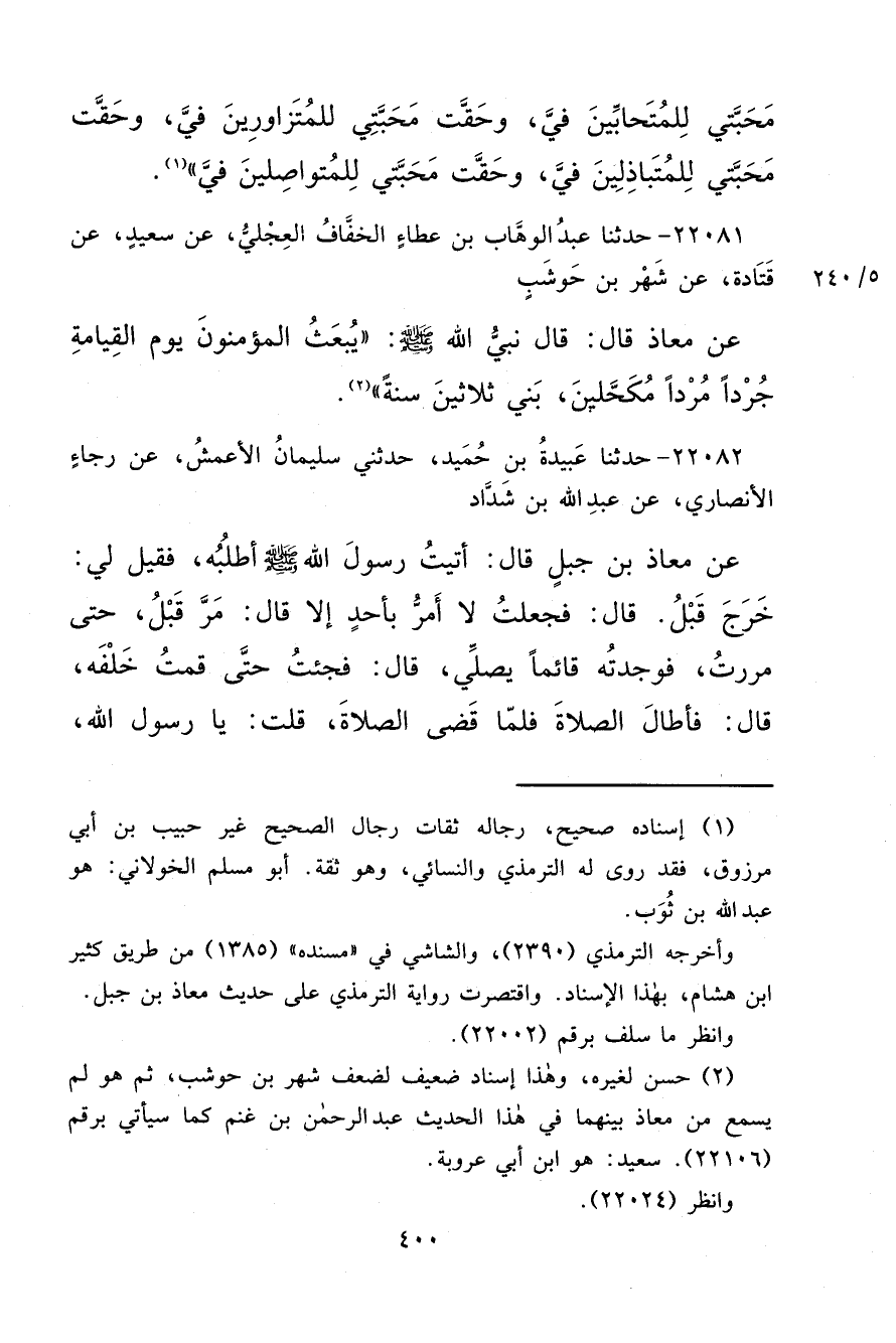 ٢٢٠٨١ - حَدَّثَنَا عَبْدُ الْوَهَّابِ بْنُ عَطَاءٍ الْخَفَّافُ الْعِجْلِيُّ، عَنْ سَعِيدٍ، عَنْ قَتَادَةَ، عَنْ شَهْرِ بْنِ حَوْشَبٍ، عَنْ مُعَاذٍ قَالَ: قَالَ نَبِيُّ اللهِ صَلَّى اللهُ عَلَيْهِ وَسَلَّمَ: " يُبْعَثُ الْمُؤْمِنُونَ يَوْمَ الْقِيَامَةِ جُرْدًا مُرْدًا مُكَحَّلِينَ بَنِي ثَلَاثِينَ سَنَةً " (٢)
