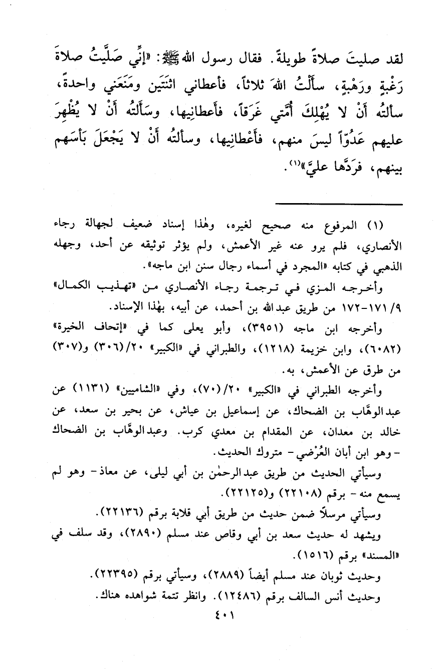 لَقَدْ صَلَّيْتَ صَلَاةً طَوِيلَةً. فَقَالَ رَسُولُ اللهِ صَلَّى اللهُ عَلَيْهِ وَسَلَّمَ: " إِنِّي صَلَّيْتُ صَلَاةَ رَغْبَةٍ وَرَهْبَةٍ، سَأَلْتُ اللهَ ثَلَاثًا فَأَعْطَانِي اثْنَتَيْنِ وَمَنَعَنِي وَاحِدَةً، سَأَلْتُهُ أَنْ: لَا يُهْلِكَ أُمَّتِي غَرَقًا فَأَعْطَانِيهَا، وَسَأَلْتُهُ أَنْ لَا يُظْهِرَ عَلَيْهِمْ عَدُوًّا لَيْسَ مِنْهُمْ فَأَعْطَانِيهَا، وَسَأَلْتُهُ أَنْ لَا يَجْعَلَ بَأْسَهُمْ بَيْنَهُمْ فَرَدَّهَا عَلَيَّ " (١)