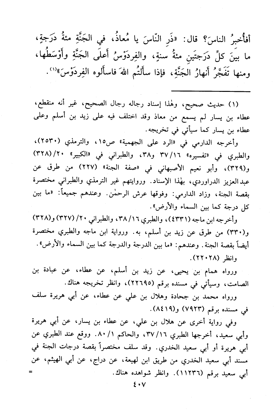 وأخرجه الدارمي في "الرد على الجهمية" ص ١٥، والترمذي (٢٥٣٠) ، والطبري في "تفسيره" ١٦/٣٧ و٣٨، والطبراني في "الكبير" ٢٠/ (٣٢٨) و (٣٢٩) ، وأبو نعيم الأصبهاني في "صفة الجنة" (٢٢٧) من طرق عن عبد العزيز الدراوردي، بهذا الإسناد. وروايتهم غير الترمذي والطبراني مختصرة بقصة الجنة، وزاد الدارمي: وفوقها عرش الرحمن. وعندهم جميعاً: "ما بين كل درجة كما بين السماء والأرض".