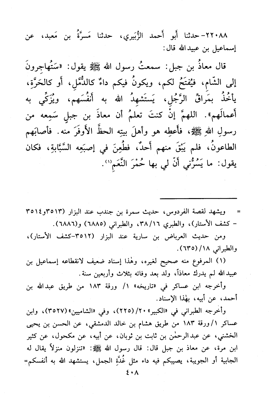 ٢٢٠٨٨ - حَدَّثَنَا أَبُو أَحْمَدَ الزُّبَيْرِيُّ، حَدَّثَنَا مَسَرَّةُ بْنُ مَعْبَدٍ، عَنْ إِسْمَاعِيلَ بْنِ عُبَيْدِ اللهِ قَالَ: قَالَ مُعَاذُ بْنُ جَبَلٍ: سَمِعْتُ رَسُولَ اللهِ صَلَّى اللهُ عَلَيْهِ وَسَلَّمَ يَقُولُ: " سَتُهَاجِرُونَ إِلَى الشَّامِ فَيُفْتَحُ لَكُمْ وَيَكُونُ فِيكُمْ دَاءٌ كَالدُّمَّلِ أَوْ كَالْحَرَّةِ يَأْخُذُ بِمَرَاقِّ الرَّجُلِ يَسْتَشْهِدُ اللهُ بِهِ أَنْفُسَهُمْ، وَيُزَكِّي بِهِ أَعْمَالَهُمْ " اللهُمَّ إِنْ كُنْتَ تَعْلَمُ أَنَّ مُعَاذَ بْنَ جَبَلٍ سَمِعَهُ مِنْ رَسُولِ اللهِ صَلَّى اللهُ عَلَيْهِ وَسَلَّمَ فَأَعْطِهِ هُوَ وَأَهْلَ بَيْتِهِ الْحَظَّ الْأَوْفَرَ مِنْهُ، فَأَصَابَهُمُ الطَّاعُونُ فَلَمْ يَبْقَ مِنْهُمْ أَحَدٌ فَطُعِنَ فِي أُصْبُعِهِ السَّبَّابَةِ، فَكَانَ يَقُولُ: مَا يَسُرُّنِي أَنَّ لِي بِهَا حُمْرَ النَّعَمِ (١)