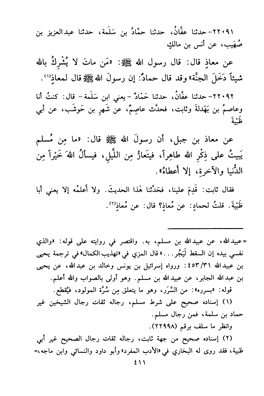 ٢٢٠٩٢ - حَدَّثَنَا عَفَّانُ، حَدَّثَنَا حَمَّادٌ يَعْنِي ابْنَ سَلَمَةَ قَالَ: كُنْتُ أَنَا وَعَاصِمُ بْنُ بَهْدَلَةَ، وَثَابِتٌ، فَحَدَّثَ عَاصِمٌ، عَنْ شَهْرِ بْنِ حَوْشَبٍ، عَنْ أَبِي ظَبْيَةَ، عَنْ مُعَاذِ بْنِ جَبَلٍ، أَنَّ رَسُولَ اللهِ صَلَّى اللهُ عَلَيْهِ وَسَلَّمَ قَالَ: " مَا مِنْ مُسْلِمٍ يَبِيتُ عَلَى ذِكْرِ اللهِ طَاهِرًا، فَيَتَعَارَّ مِنَ اللَّيْلِ فَيَسْأَلُ اللهَ خَيْرًا مِنَ الدُّنْيَا وَالْآخِرَةِ إِلَّا أَعْطَاهُ " فَقَالَ ثَابِتٌ: قَدِمَ عَلَيْنَا فَحَدَّثَنَا هَذَا الْحَدِيثَ وَلَا أَعْلَمُهُ إِلَّا يَعْنِي أَبَا ظَبْيَةَ. قُلْتُ لِحَمَّادٍ: عَنْ مُعَاذٍ؟ قَالَ: عَنْ مُعَاذٍ (٢)