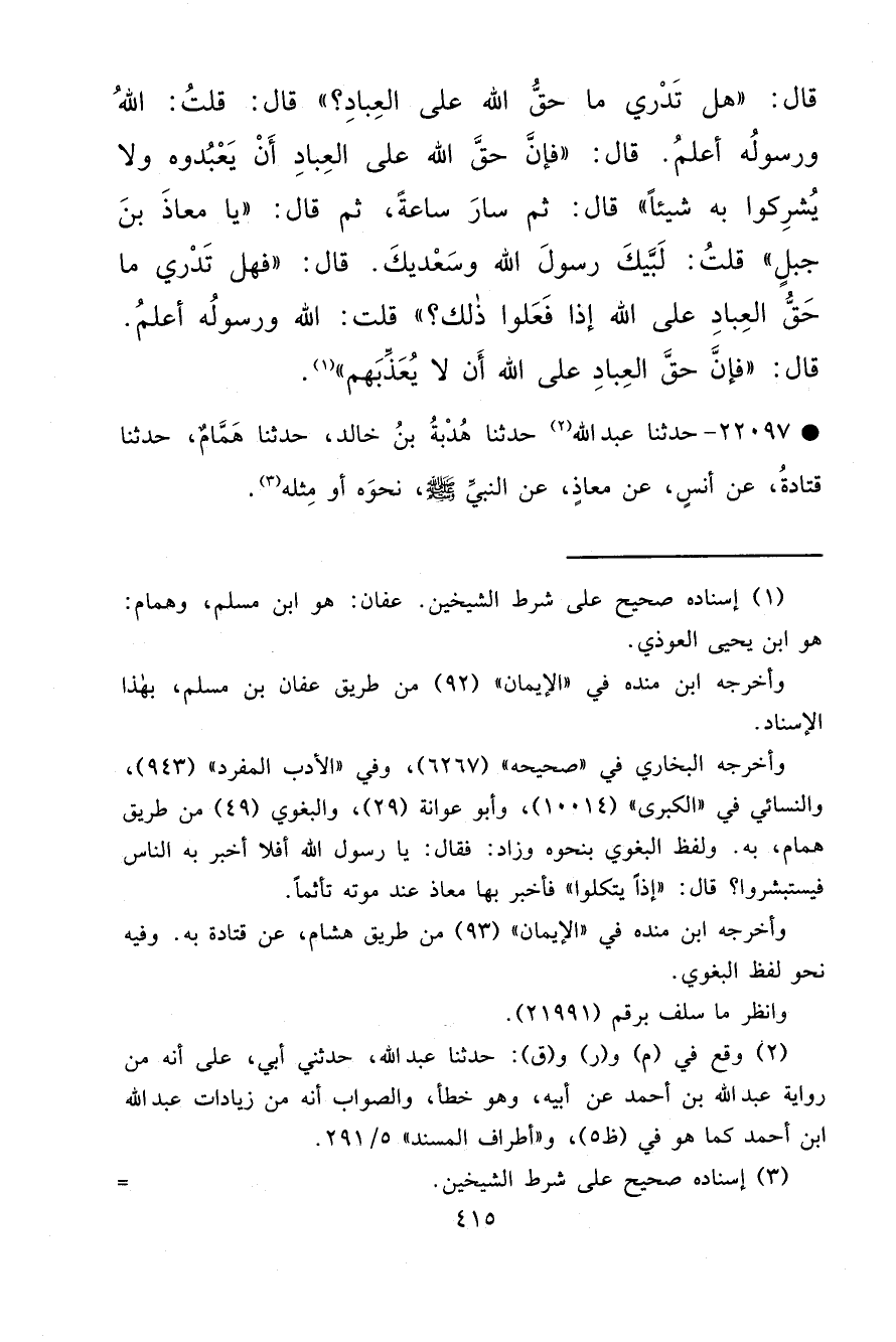 • ٢٢٠٩٧ - حَدَّثَنَا عَبْدُ اللهِ، (٢) حَدَّثَنَا هُدْبَةُ بْنُ خَالِدٍ، حَدَّثَنَا هَمَّامٌ، حَدَّثَنَا قَتَادَةُ، عَنْ أَنَسٍ، عَنْ مُعَاذٍ، عَنِ النَّبِيِّ صَلَّى اللهُ عَلَيْهِ وَسَلَّمَ نَحْوَهُ أَوْ مِثْلَهُ. (٣)