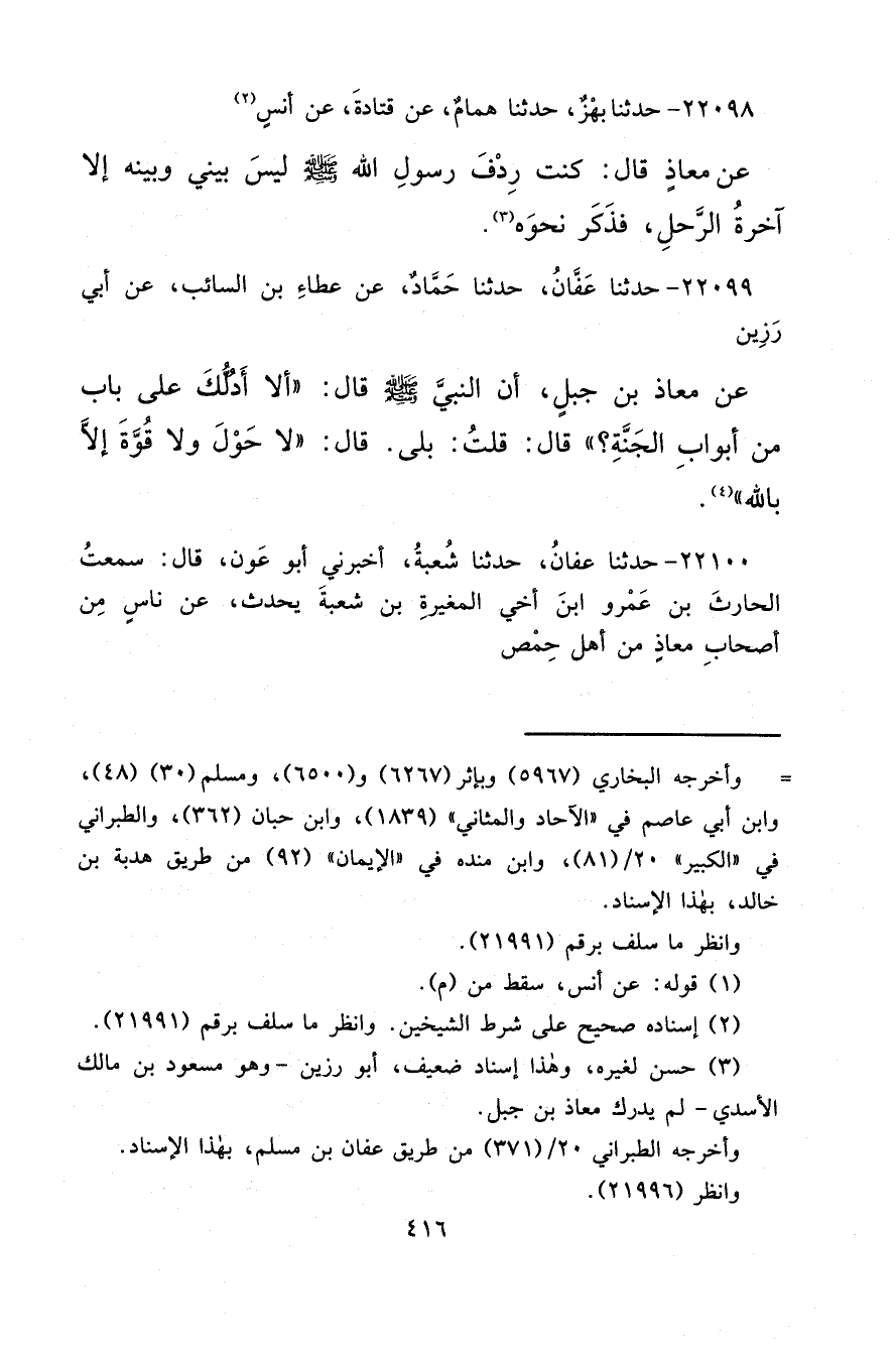 ٢٢٠٩٩ - حَدَّثَنَا عَفَّانُ، حَدَّثَنَا حَمَّادٌ، عَنْ عَطَاءِ بْنِ السَّائِبِ، عَنْ أَبِي رَزِينٍ، عَنْ مُعَاذِ بْنِ جَبَلٍ، أَنَّ النَّبِيَّ صَلَّى اللهُ عَلَيْهِ وَسَلَّمَ قَالَ: " أَلَا أَدُلُّكَ عَلَى بَابٍ مِنْ أَبْوَابِ الْجَنَّةِ؟ " قَالَ: قُلْتُ: بَلَى. قَالَ: " لَا حَوْلَ وَلَا قُوَّةَ إِلَّا بِاللهِ " (٣)
