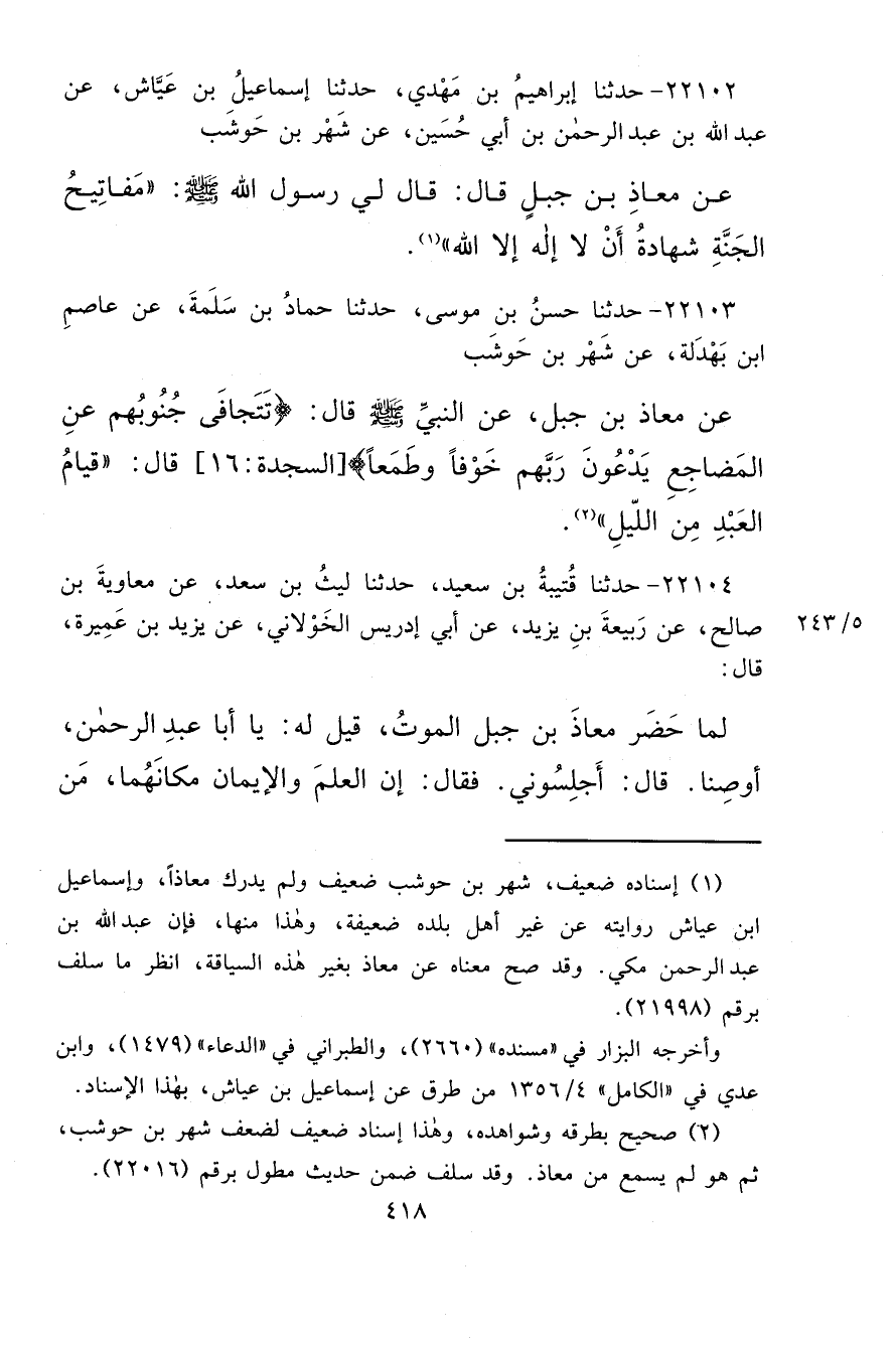 (١) إسناده ضعيف، شهر بن حوشب ضعيف ولم يدرك معاذاً، وإسماعيل ابن عياش روايته عن غير أهل بلده ضعيفة، وهذا منها، فإن عبد الله بن عبد الرحمن مكي. وقد صح معناه عن معاذ بغير هذه السياقة، انظر ما سلف برقم (٢١٩٩٨) .