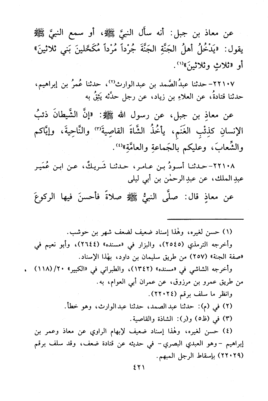 ٢٢١٠٧ - حَدَّثَنَا عَبْدُ الصَّمَدِ بْنُ عَبْدِ الْوَارِثِ (٢) ، حَدَّثَنَا عُمَرُ بْنُ إِبْرَاهِيمَ، حَدَّثَنَا قَتَادَةُ، عَنِ الْعَلَاءِ بْنِ زِيَادٍ، عَنْ رَجُلٍ حَدَّثَهُ يَثِقُ بِهِ، عَنْ مُعَاذِ بْنِ جَبَلٍ، عَنْ رَسُولِ اللهِ صَلَّى اللهُ عَلَيْهِ وَسَلَّمَ: " إِنَّ الشَّيْطَانَ ذِئْبُ الْإِنْسَانِ كَذِئْبِ الْغَنَمِ يَأْخُذُ الشَّاةَ الْقَاصِيَةَ (٣) وَالنَّاحِيَةَ، وَإِيَّاكُمْ وَالشِّعَابَ وَعَلَيْكُمْ بِالْجَمَاعَةِ وَالْعَامَّةِ " (٤)