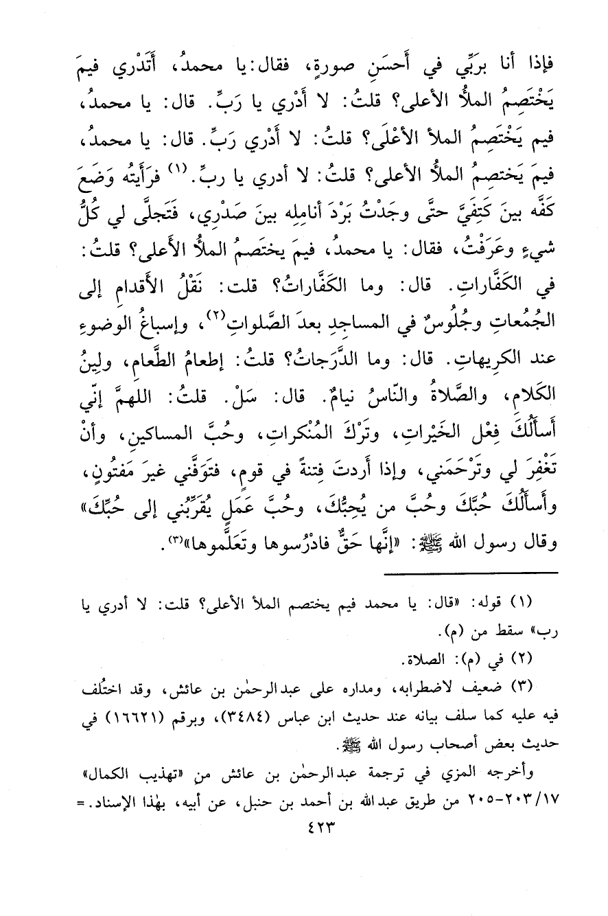 فَإِذَا أَنَا بِرَبِّي فِي أَحْسَنِ صُورَةٍ. فَقَالَ: يَا مُحَمَّدُ أَتَدْرِي فِيمَ يَخْتَصِمُ الْمَلَأُ الْأَعْلَى؟ قُلْتُ: لَا أَدْرِي يَا رَبِّ. قَالَ: يَا مُحَمَّدُ فِيمَ يَخْتَصِمُ الْمَلَأُ الْأَعْلَى؟ قُلْتُ: لَا أَدْرِي رَبِّ، قَالَ: يَا مُحَمَّدُ فِيمَ يَخْتَصِمُ الْمَلَأُ الْأَعْلَى؟ قُلْتُ: لَا أَدْرِي يا رَبِّ (١) ، فَرَأَيْتُهُ وَضَعَ كَفَّهُ بَيْنَ كَتِفَيَّ حَتَّى وَجَدْتُ بَرْدَ أَنَامِلِهِ بَيْنَ صَدْرِي فَتَجَلَّى لِي كُلُّ شَيْءٍ وَعَرَفْتُ فَقَالَ: يَا مُحَمَّدُ فِيمَ يَخْتَصِمُ الْمَلَأُ الْأَعْلَى؟ قُلْتُ: فِي الْكَفَّارَاتِ. قَالَ: وَمَا الْكَفَّارَاتُ؟ قُلْتُ: نَقْلُ الْأَقْدَامِ إِلَى الْجُمُعَاتِ، وَجُلُوسٌ فِي الْمَسَاجِدِ بَعْدَ الصَّلَواتِ، (٢) وَإِسْبَاغُ الْوُضُوءِ عِنْدَ الْكَرِيهَاتِ. قَالَ: وَمَا الدَّرَجَاتُ؟ قُلْتُ: إِطْعَامُ الطَّعَامِ، وَلِينُ الْكَلَامِ، وَالصَّلَاةُ وَالنَّاسُ نِيَامٌ. قَالَ: سَلْ. قُلْتُ: اللهُمَّ إِنِّي أَسْأَلُكَ فِعْلَ الْخَيْرَاتِ وَتَرْكَ الْمُنْكَرَاتِ، وَحُبَّ الْمَسَاكِينِ، وَأَنْ تَغْفِرَ لِي وَتَرْحَمَنِي، وَإِذَا أَرَدْتَ فِتْنَةً فِي قَوْمٍ فَتَوَفَّنِي غَيْرَ مَفْتُونٍ، وَأَسْأَلُكَ حُبَّكَ وَحُبَّ مَنْ يُحِبُّكَ وَحُبَّ عَمَلٍ يُقَرِّبُنِي إِلَى حُبِّكَ ". وَقَالَ رَسُولُ اللهِ صَلَّى اللهُ عَلَيْهِ وَسَلَّمَ: " إِنَّهَا حَقٌّ فَادْرُسُوهَا وَتَعَلَّمُوهَا " (٣)