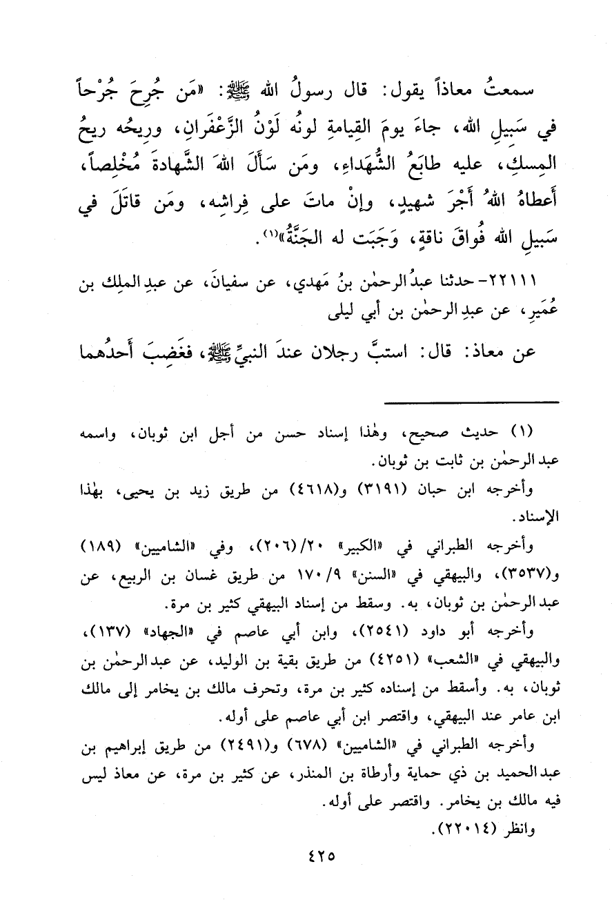 سَمِعْتُ مُعَاذًا يَقُولُ: قَالَ رَسُولُ اللهِ صَلَّى اللهُ عَلَيْهِ وَسَلَّمَ: " مَنْ جُرِحَ جُرْحًا فِي سَبِيلِ اللهِ جَاءَ يَوْمَ الْقِيَامَةِ لَوْنُهُ لَوْنُ الزَّعْفَرَانِ، وَرِيحُهُ رِيحُ الْمِسْكِ عَلَيْهِ طَابَعُ الشُّهَدَاءِ، وَمَنْ سَأَلَ اللهَ الشَّهَادَةَ مُخْلِصًا أَعْطَاهُ اللهُ أَجْرَ شَهِيدٍ، وَإِنْ مَاتَ عَلَى فِرَاشِهِ وَمَنْ قَاتَلَ فِي سَبِيلِ اللهِ فُوَاقَ نَاقَةٍ وَجَبَتْ لَهُ الْجَنَّةُ " (١)