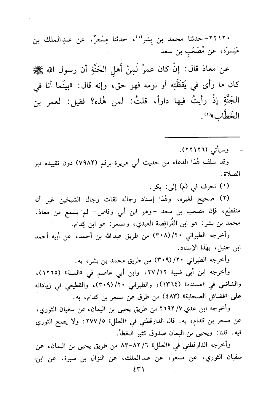 ٢٢١٢٠ - حَدَّثَنَا مُحَمَّدُ بْنُ بِشْرٍ، (١) حَدَّثَنَا مِسْعَرٌ، عَنْ عَبْدِ الْمَلِكِ بْنِ مَيْسَرَةَ، عَنْ مُصْعَبِ بْنِ سَعْدٍ، عَنْ مُعَاذٍ قَالَ: إِنْ كَانَ عُمَرُ لَمِنْ أَهْلِ الْجَنَّةِ إِنَّ رَسُولَ اللهِ صَلَّى اللهُ عَلَيْهِ وَسَلَّمَ كَانَ مَا رَأَى فِي يَقَظَتِهِ أَوْ نَوْمِهِ فَهُوَ حَقٌّ وَإِنَّهُ قَالَ: " بَيْنَمَا أَنَا فِي الْجَنَّةِ إِذْ رَأَيْتُ فِيهَا دَارًا فَقُلْتُ: لِمَنْ هَذِهِ؟ فَقِيلَ: لِعُمَرَ بْنِ الْخَطَّابِ " (٢)