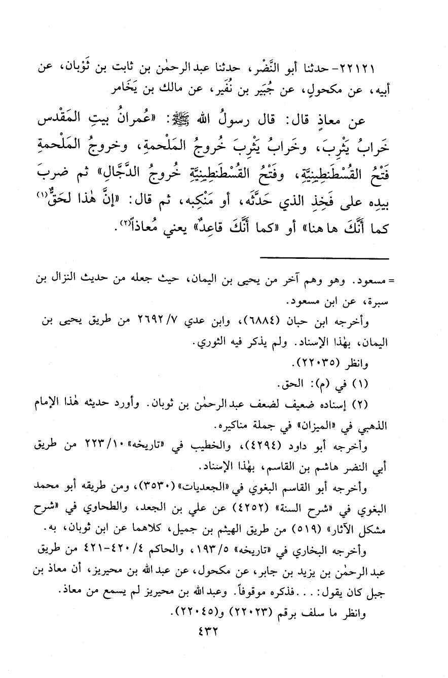 ٢٢١٢١ - حَدَّثَنَا أَبُو النَّضْرِ، حَدَّثَنَا عَبْدُ الرَّحْمَنِ بْنُ ثَابِتِ بْنِ ثَوْبَانَ، عَنْ أَبِيهِ، عَنْ مَكْحُولٍ، عَنْ جُبَيْرِ بْنِ نُفَيْرٍ، عَنْ مَالِكِ بْنِ يَخَامِرَ، عَنْ مُعَاذٍ قَالَ: قَالَ رَسُولُ اللهِ صَلَّى اللهُ عَلَيْهِ وَسَلَّمَ: " عُمْرَانُ بَيْتِ الْمَقْدِسِ خَرَابُ يَثْرِبَ، وَخَرَابُ يَثْرِبَ خُرُوجُ الْمَلْحَمَةِ، وَخُرُوجُ الْمَلْحَمَةِ فَتْحُ الْقُسْطَنْطِينِيَّةِ، وَفَتْحُ الْقُسْطَنْطِينِيَّةِ خُرُوجُ الدَّجَّالِ ". ثُمَّ ضَرَبَ بِيَدِهِ عَلَى فَخِذِ الَّذِي حَدَّثَهُ أَوْ مَنْكِبِهِ، ثُمَّ قَالَ: " إِنَّ هَذَا لَحَقٌّ (١) كَمَا أَنَّكَ هَاهُنَا ". أَوْ كَمَا " أَنَّكَ قَاعِدٌ " يَعْنِي: مُعَاذًا (٢)