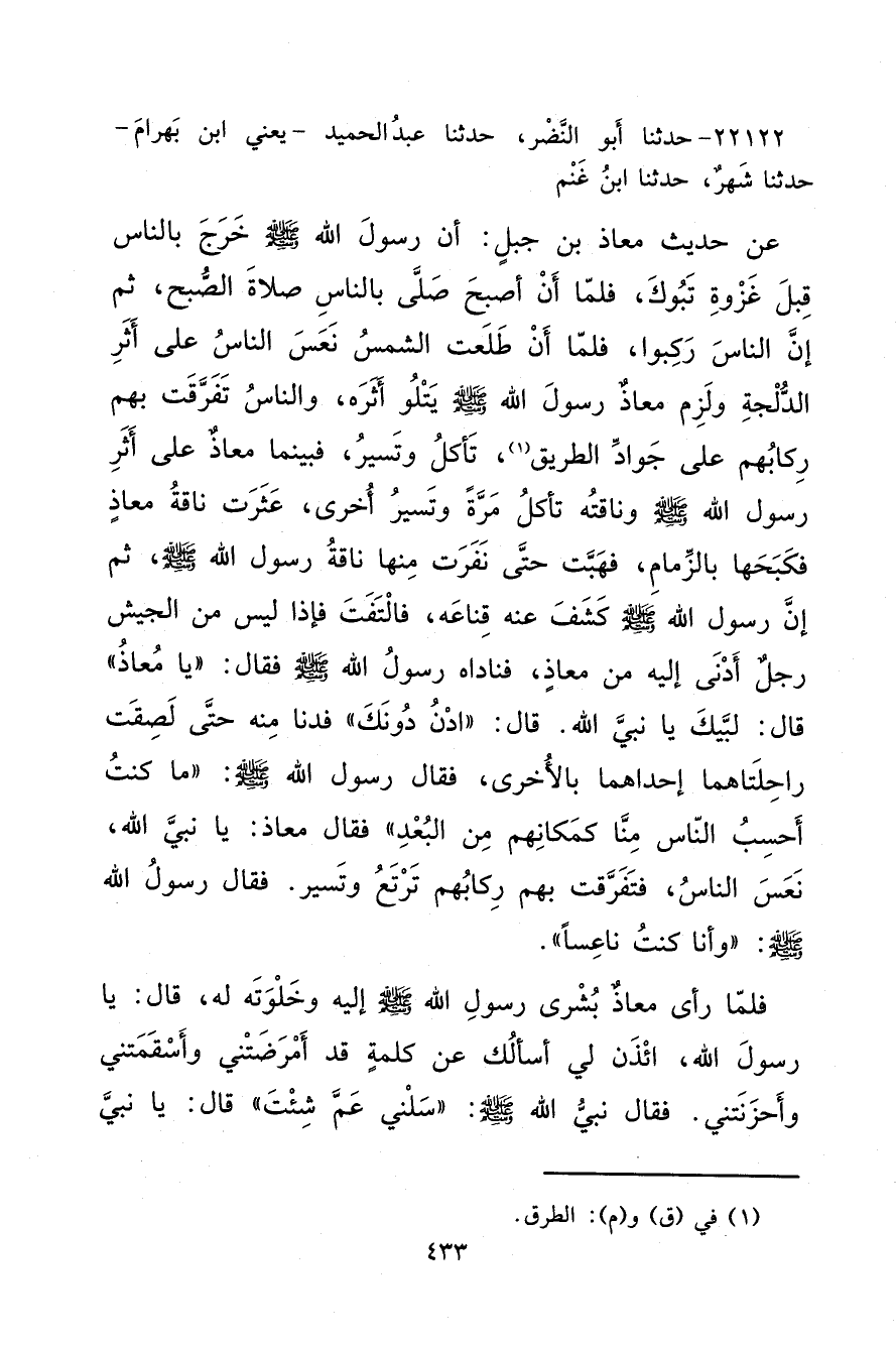 ٢٢١٢٢ - حَدَّثَنَا أَبُو النَّضْرِ، حَدَّثَنَا عَبْدُ الْحَمِيدِ يَعْنِي ابْنَ بَهْرَامَ، حَدَّثَنَا شَهْرٌ، حَدَّثَنَا ابْنُ غَنْمٍ، عَنْ حَدِيثِ مُعَاذِ بْنِ جَبَلٍ، أَنَّ رَسُولَ اللهِ صَلَّى اللهُ عَلَيْهِ وَسَلَّمَ خَرَجَ بِالنَّاسِ قِبَلَ غَزْوَةِ تَبُوكَ، فَلَمَّا أَنْ أَصْبَحَ صَلَّى بِالنَّاسِ صَلَاةَ الصُّبْحِ، ثُمَّ إِنَّ النَّاسَ رَكِبُوا، فَلَمَّا أَنْ طَلَعَتِ الشَّمْسُ نَعَسَ النَّاسُ عَلَى أَثَرِ الدُّلْجَةِ، وَلَزِمَ مُعَاذٌ رَسُولَ اللهِ صَلَّى اللهُ عَلَيْهِ وَسَلَّمَ يَتْلُو أَثَرَهُ، وَالنَّاسُ تَفَرَّقَتْ بِهِمْ رِكَابُهُمْ عَلَى جَوَادِّ الطَّرِيقِ (١) تَأْكُلُ وَتَسِيرُ، فَبَيْنَمَا مُعَاذٌ عَلَى أَثَرِ رَسُولِ اللهِ صَلَّى اللهُ عَلَيْهِ وَسَلَّمَ، وَنَاقَتُهُ تَأْكُلُ مَرَّةً وَتَسِيرُ أُخْرَى عَثَرَتْ نَاقَةُ مُعَاذٍ، فَكَبَحَهَا بِالزِّمَامِ، فَهَبَّتْ حَتَّى نَفَرَتْ مِنْهَا نَاقَةُ رَسُولِ اللهِ صَلَّى اللهُ عَلَيْهِ وَسَلَّمَ، ثُمَّ إِنَّ رَسُولَ اللهِ صَلَّى اللهُ عَلَيْهِ وَسَلَّمَ كَشْفَ عَنْهُ قِنَاعَهُ، فَالْتَفَتَ فَإِذَا لَيْسَ مِنَ الْجَيْشِ رَجُلٌ أَدْنَى إِلَيْهِ مِنْ مُعَاذٍ، فَنَادَاهُ رَسُولُ اللهِ صَلَّى اللهُ عَلَيْهِ وَسَلَّمَ فَقَالَ: " يَا مُعَاذُ ". قَالَ: لَبَّيْكَ يَا نَبِيَّ اللهِ. قَالَ: " ادْنُ دُونَكَ ". فَدَنَا مِنْهُ حَتَّى لَصِقَتْ رَاحِلَتَاهُمَا إِحْدَاهُمَا بِالْأُخْرَى، فَقَالَ رَسُولُ اللهِ صَلَّى اللهُ عَلَيْهِ وَسَلَّمَ: " مَا كُنْتُ أَحْسِبُ النَّاسَ مِنَّا كَمَكَانِهِمْ مِنَ الْبُعْدِ ". فَقَالَ مُعَاذٌ: يَا نَبِيَّ اللهِ نَعَسَ النَّاسُ، فَتَفَرَّقَتْ بِهِمْ رِكَابُهُمْ تَرْتَعُ وَتَسِيرُ. فَقَالَ رَسُولُ اللهِ صَلَّى اللهُ عَلَيْهِ وَسَلَّمَ: " وَأَنَا كُنْتُ نَاعِسًا ". فَلَمَّا رَأَى مُعَاذٌ بُشْرَى رَسُولِ اللهِ صَلَّى اللهُ عَلَيْهِ وَسَلَّمَ إِلَيْهِ وَخَلْوَتَهُ لَهُ قَالَ: يَا رَسُولَ اللهِ، ائْذَنْ لِي أَسْأَلْكَ عَنْ كَلِمَةٍ قَدْ أَمْرَضَتْنِي وَأَسْقَمَتْنِي وَأَحْزَنَتْنِي. فَقَالَ نَبِيُّ اللهِ صَلَّى اللهُ عَلَيْهِ وَسَلَّمَ: " سَلْنِي عَمَّ شِئْتَ ". قَالَ: يَا نَبِيَّ