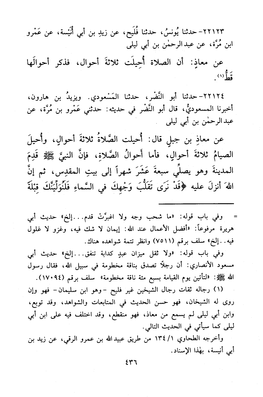 ٢٢١٢٤ - حَدَّثَنَا أَبُو النَّضْرِ، حَدَّثَنَا الْمَسْعُودِيُّ، وَيَزِيدُ بْنُ هَارُونَ أَخْبَرَنَا الْمَسْعُودِيُّ قَالَ: أَبُو النَّضْرِ فِي حَدِيثِهِ حَدَّثَنِي عَمْرُو بْنُ مُرَّةَ، عَنْ عَبْدِ الرَّحْمَنِ بْنِ أَبِي لَيْلَى، عَنْ مُعَاذِ بْنِ جَبَلٍ قَالَ: أُحِيلَتِ الصَّلَاةُ ثَلَاثَةَ أَحْوَالٍ، وَأُحِيلَ الصِّيَامُ ثَلَاثَةَ أَحْوَالٍ، فَأَمَّا أَحْوَالُ الصَّلَاةِ: فَإِنَّ النَّبِيَّ صَلَّى اللهُ عَلَيْهِ وَسَلَّمَ قَدِمَ الْمَدِينَةَ وَهُوَ يُصَلِّي سَبْعَةَ عَشَرَ شَهْرًا إِلَى بَيْتِ الْمَقْدِسِ، ثُمَّ إِنَّ اللهَ أَنْزَلَ عَلَيْهِ {قَدْ نَرَى تَقَلُّبَ وَجْهِكَ فِي السَّمَاءِ فَلَنُوَلِّيَنَّكَ قِبْلَةً