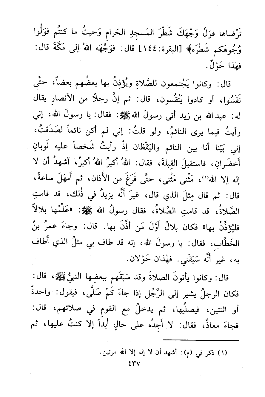 تَرْضَاهَا فَوَلِّ وَجْهَكَ شَطْرَ الْمَسْجِدِ الْحَرَامِ، وَحَيْثُ مَا كُنْتُمْ فَوَلُّوا وُجُوهَكُمْ شَطْرَهُ} [البقرة: ١٤٤] قَالَ: فَوَجَّهَهُ اللهُ إِلَى مَكَّةَ قَالَ: فَهَذَا حَوْلٌ. قَالَ: وَكَانُوا يَجْتَمِعُونَ لِلصَّلَاةِ وَيُؤْذِنُ بِهَا بَعْضُهُمْ بَعْضًا حَتَّى نَقَسُوا أَوْ كَادُوا يَنْقُسُونَ. قَالَ ثُمَّ إِنَّ رَجُلًا مِنَ الْأَنْصَارِ يُقَالُ لَهُ عَبْدُ اللهِ بْنُ زَيْدٍ أَتَى رَسُولَ اللهِ صَلَّى اللهُ عَلَيْهِ وَسَلَّمَ فَقَالَ: يَا رَسُولَ اللهِ، إِنِّي رَأَيْتُ فِيمَا يَرَى النَّائِمُ وَلَوْ قُلْتُ إِنِّي لَمْ أَكُنْ نَائِمًا لَصَدَقْتُ، إِنِّي بَيْنَا أَنَا بَيْنَ النَّائِمِ وَالْيَقْظَانِ إِذْ رَأَيْتُ شَخْصًا عَلَيْهِ ثَوْبَانِ أَخْضَرَانِ فَاسْتَقْبَلَ الْقِبْلَةَ، فَقَالَ: اللهُ أَكْبَرُ. اللهُ أَكْبَرُ. أَشْهَدُ أَنْ لَا إِلَهَ إِلَّا اللهُ (١) . مَثْنَى مَثْنَى حَتَّى فَرَغَ مِنَ الْأَذَانِ، ثُمَّ أَمْهَلَ سَاعَةً. قَالَ: ثُمَّ قَالَ مِثْلَ الَّذِي قَالَ غَيْرَ أَنَّهُ يَزِيدُ فِي ذَلِكَ قَدْ قَامَتِ الصَّلَاةُ، قَدْ قَامَتِ الصَّلَاةُ، فَقَالَ رَسُولُ اللهِ صَلَّى اللهُ عَلَيْهِ وَسَلَّمَ: " عَلِّمْهَا بِلَالًا فَلْيُؤَذِّنْ بِهَا ". فَكَانَ بِلَالٌ أَوَّلَ مَنْ أَذَّنَ بِهَا. قَالَ: وَجَاءَ عُمَرُ بْنُ الْخَطَّابِ فَقَالَ: يَا رَسُولَ اللهِ، إِنَّهُ قَدْ طَافَ بِي مِثْلُ الَّذِي أَطَافَ بِهِ غَيْرَ أَنَّهُ سَبَقَنِي فَهَذَانِ حَوْلَانِ. قَالَ: وَكَانُوا يَأْتُونَ الصَّلَاةَ، وَقَدْ سَبَقَهُمْ بِبَعْضِهَا النَّبِيُّ صَلَّى اللهُ عَلَيْهِ وَسَلَّمَ قَالَ: فَكَانَ الرَّجُلُ يُشِيرُ إِلَى الرَّجُلِ إِذَا جَاءَ كَمْ صَلَّى؟ فَيَقُولُ: وَاحِدَةً أَوْ اثْنَتَيْنِ فَيُصَلِّيهَا، ثُمَّ يَدْخُلُ مَعَ الْقَوْمِ فِي صَلَاتِهِمْ قَالَ: فَجَاءَ مُعَاذٌ فَقَالَ: لَا أَجِدُهُ عَلَى حَالٍ أَبَدًا إِلَّا كُنْتُ عَلَيْهَا، ثُمَّ