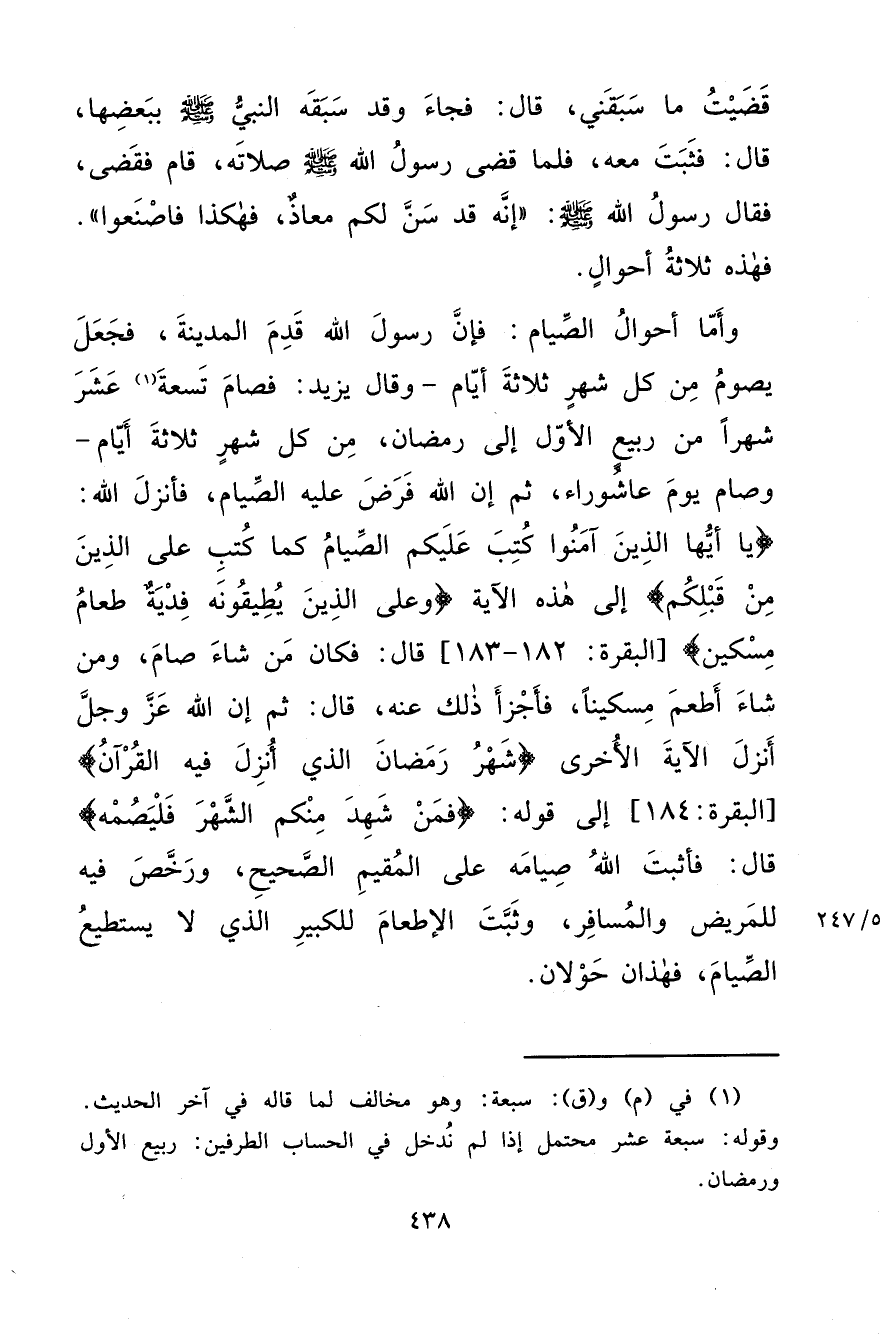 قَضَيْتُ مَا سَبَقَنِي. قَالَ: فَجَاءَ وَقَدْ سَبَقَهُ النَّبِيُّ صَلَّى اللهُ عَلَيْهِ وَسَلَّمَ بِبَعْضِهَا قَالَ: فَثَبَتَ مَعَهُ، فَلَمَّا قَضَى رَسُولُ اللهِ صَلَّى اللهُ عَلَيْهِ وَسَلَّمَ صَلَاتَهُ قَامَ فَقَضَى فَقَالَ رَسُولُ اللهِ صَلَّى اللهُ عَلَيْهِ وَسَلَّمَ: " إِنَّهُ قَدْ سَنَّ لَكُمْ مُعَاذٌ فَهَكَذَا فَاصْنَعُوا " فَهَذِهِ ثَلَاثَةُ أَحْوَالٍ، وَأَمَّا أَحْوَالُ الصِّيَامِ: فَإِنَّ رَسُولَ اللهِ صَلَّى اللهُ عَلَيْهِ وَسَلَّمَ قَدِمَ الْمَدِينَةَ فَجَعَلَ يَصُومُ مِنْ كُلِّ شَهْرٍ ثَلَاثَةَ أَيَّامٍ، وَقَالَ يَزِيدُ: فَصَامَ تِسْعَةَ (١) عَشَرَ شَهْرًا مِنْ رَبِيعِ الْأَوَّلِ إِلَى رَمَضَانَ مِنْ كُلِّ شَهْرٍ ثَلَاثَةَ أَيَّامٍ، وَصَامَ يَوْمَ عَاشُورَاءَ ثُمَّ إِنَّ اللهَ فَرَضَ عَلَيْهِ الصِّيَامَ، فَأَنْزَلَ اللهُ {يَا أَيُّهَا الَّذِينَ آمَنُوا كُتِبَ عَلَيْكُمُ الصِّيَامُ كَمَا كُتِبَ عَلَى الَّذِينَ مِنْ قَبْلِكُمْ} [البقرة: ١٨٣] إِلَى هَذِهِ الْآيَةِ {وَعَلَى الَّذِينَ يُطِيقُونَهُ فِدْيَةٌ طَعَامُ مِسْكِينٍ} [البقرة: ١٨٤] قَالَ: فَكَانَ مَنْ شَاءَ صَامَ، وَمَنْ شَاءَ أَطْعَمَ مِسْكِينًا، فَأَجْزَأَ ذَلِكَ عَنْهُ قَالَ: ثُمَّ إِنَّ اللهَ عَزَّ وَجَلَّ أَنْزَلَ الْآيَةَ الْأُخْرَى {شَهْرُ رَمَضَانَ الَّذِي أُنْزِلَ فِيهِ الْقُرْآنُ} [البقرة: ١٨٥] إِلَى قَوْلِهِ {فَمَنْ شَهِدَ مِنْكُمُ الشَّهْرَ فَلْيَصُمْهُ} [البقرة: ١٨٥] قَالَ: فَأَثْبَتَ اللهُ صِيَامَهُ عَلَى الْمُقِيمِ الصَّحِيحِ، وَرَخَّصَ فِيهِ لِلْمَرِيضِ وَالْمُسَافِرِ وَثَبَّتَ الْإِطْعَامَ لِلْكَبِيرِ الَّذِي لَا يَسْتَطِيعُ الصِّيَامَ، فَهَذَانِ حَوْلَانِ.