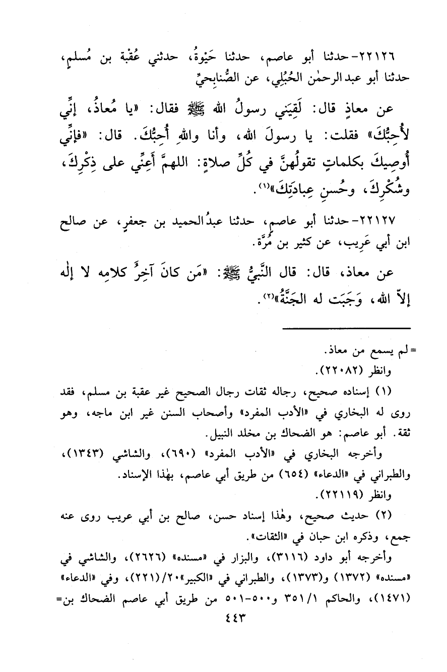 ٢٢١٢٦ - حَدَّثَنَا أَبُو عَاصِمٍ، حَدَّثَنَا حَيْوَةُ، حَدَّثَنِي عُقْبَةُ بْنُ مُسْلِمٍ، حَدَّثَنَا أَبُو عَبْدِ الرَّحْمَنِ الْحُبُلِيُّ، عَنْ الصُّنَابِحِيّ، عَنْ مُعَاذٍ قَالَ: لَقِيَنِي رَسُولُ اللهِ صَلَّى اللهُ عَلَيْهِ وَسَلَّمَ فَقَالَ: " يَا مُعَاذُ إِنِّي لَأُحِبُّكَ ". فَقُلْتُ: يَا رَسُولَ اللهِ، وَأَنَا وَاللهِ أُحِبُّكَ. قَالَ: " فَإِنِّي أُوصِيكَ بِكَلِمَاتٍ تَقُولُهُنَّ فِي كُلِّ صَلَاةٍ: اللهُمَّ أَعِنِّي عَلَى ذِكْرِكَ وَشُكْرِكَ وَحُسْنِ عِبَادَتِكَ " (١)