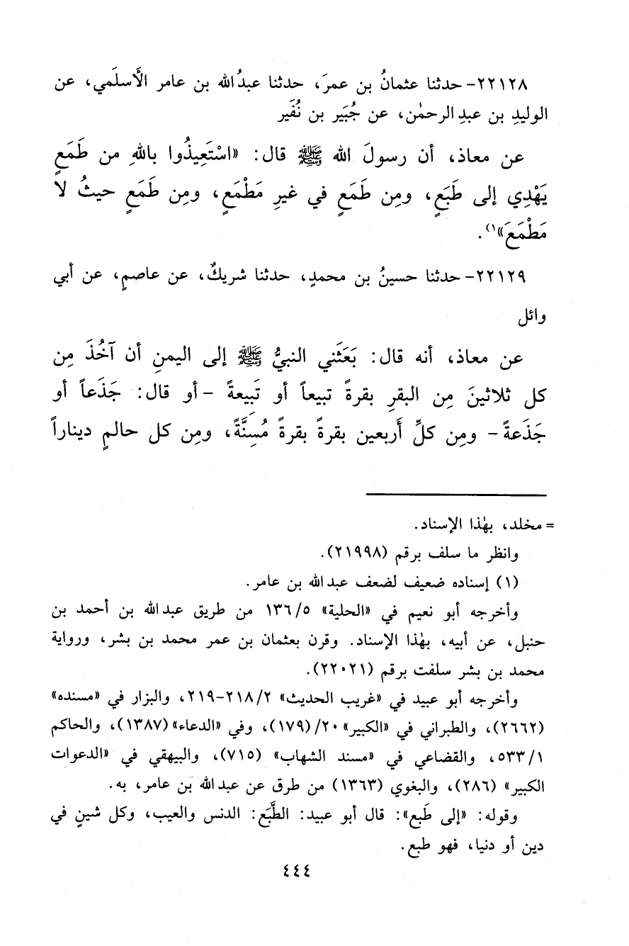 ٢٢١٢٨ - حَدَّثَنَا عُثْمَانُ بْنُ عُمَرَ، حَدَّثَنَا عَبْدُ اللهِ بْنُ عَامِرٍ الْأَسْلَمِيُّ، عَنِ الْوَلِيدِ بْنِ عَبْدِ الرَّحْمَنِ، عَنْ جُبَيْرِ بْنِ نُفَيْرٍ، عَنْ مُعَاذٍ، أَنَّ رَسُولَ اللهِ صَلَّى اللهُ عَلَيْهِ وَسَلَّمَ قَالَ: " اسْتَعِيذُوا بِاللهِ مِنْ طَمَعٍ يَهْدِي إِلَى طَبْعٍ، وَمِنْ طَمَعٍ فِي غَيْرِ مَطْمَعٍ، وَمِنْ طَمَعٍ حَيْثُ لَا مَطْمَعَ " (١)