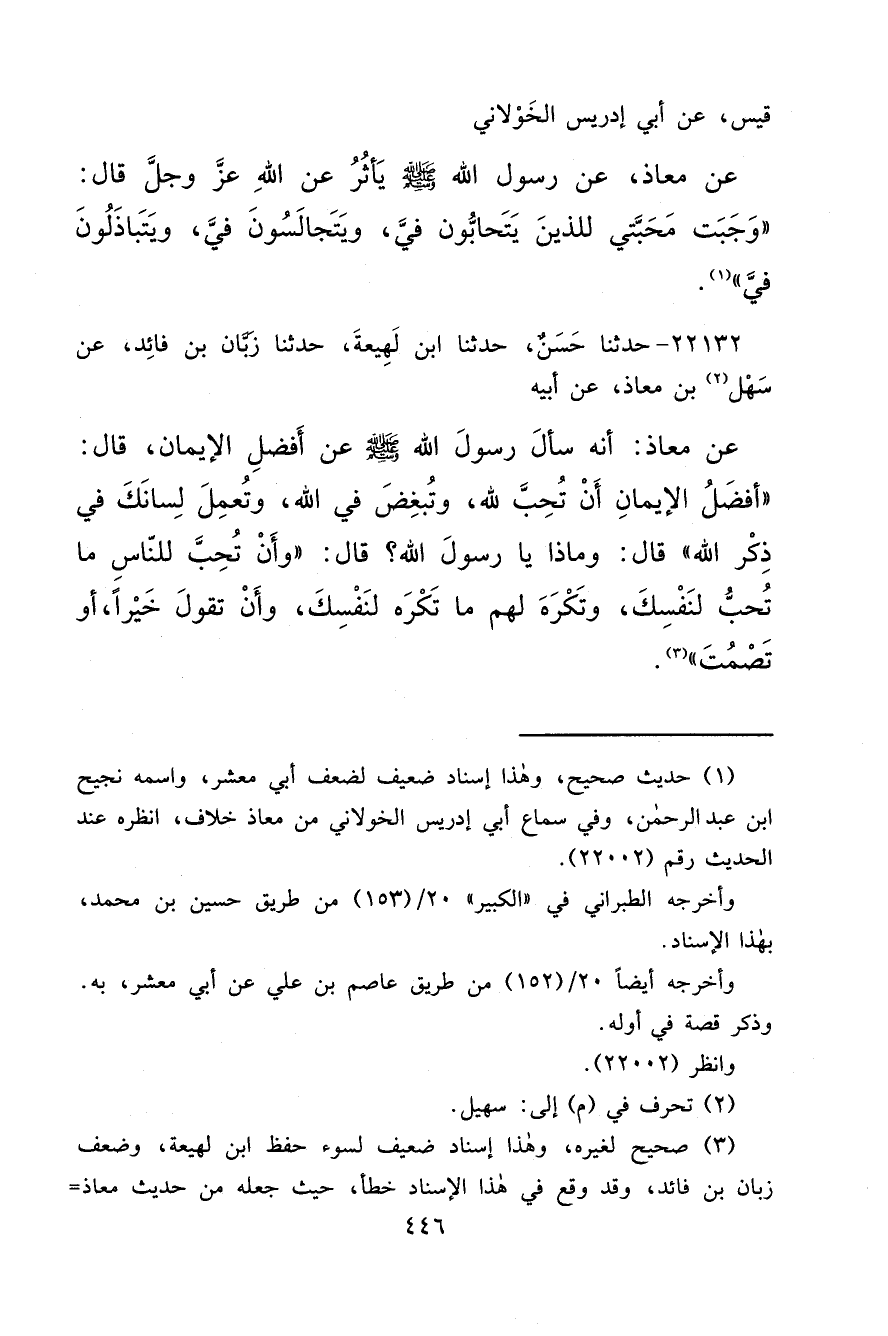 ٢٢١٣٢ - حَدَّثَنَا حَسَنٌ، حَدَّثَنَا ابْنُ لَهِيعَةَ، حَدَّثَنَا زَبَّانُ بْنُ فَائِدٍ، عَنْ سَهْلِ (٢) بْنِ مُعَاذٍ، عَنْ أَبِيهِ عَنْ مُعَاذٍ، أَنَّهُ سَأَلَ رَسُولَ اللهِ صَلَّى اللهُ عَلَيْهِ وَسَلَّمَ عَنْ أَفْضَلِ الْإِيمَانِ قَالَ: " أَفْضَلُ الْإِيمَانِ أَنْ تُحِبَّ لِلَّهِ، وَتُبْغِضَ فِي اللهِ، وَتُعْمِلَ لِسَانَكَ فِي ذِكْرِ ". قَالَ: وَمَاذَا يَا رَسُولَ اللهِ؟ قَالَ: " وَأَنْ تُحِبَّ لِلنَّاسِ مَا تُحِبُّ لِنَفْسِكَ، وَتَكْرَهَ لَهُمْ مَا تَكْرَهُ لِنَفْسِكَ، وَأَنْ تَقُولَ خَيْرًا أَوْ تَصْمُتَ " (٣)