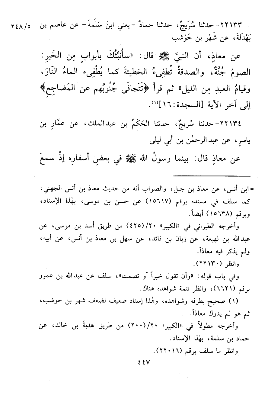 ٢٢١٣٣ - حَدَّثَنَا سُرَيْجٌ، حَدَّثَنَا حَمَّادٌ يَعْنِي ابْنَ سَلَمَةَ، عَنْ عَاصِمِ بْنِ بَهْدَلَةَ، عَنْ شَهْرِ بْنِ حَوْشَبٍ، عَنْ مُعَاذٍ، أَنَّ النَّبِيَّ صَلَّى اللهُ عَلَيْهِ وَسَلَّمَ قَالَ: " سَأُنَبِّئُكَ بِأَبْوَابٍ مِنَ الْخَيْرِ: ١٠ الصَّوْمُ جُنَّةٌ، وَالصَّدَقَةُ تُطْفِئُ الْخَطِيئَةَ كَمَا يُطْفِئُ الْمَاءُ النَّارَ، وَقِيَامُ الْعَبْدِ مِنَ اللَّيْلِ ". ثُمَّ قَرَأَ {تَتَجَافَى جُنُوبُهُمْ عَنِ الْمَضَاجِعِ} [السجدة: ١٦] (١) إِلَى آخِرِ الْآيَةِ "