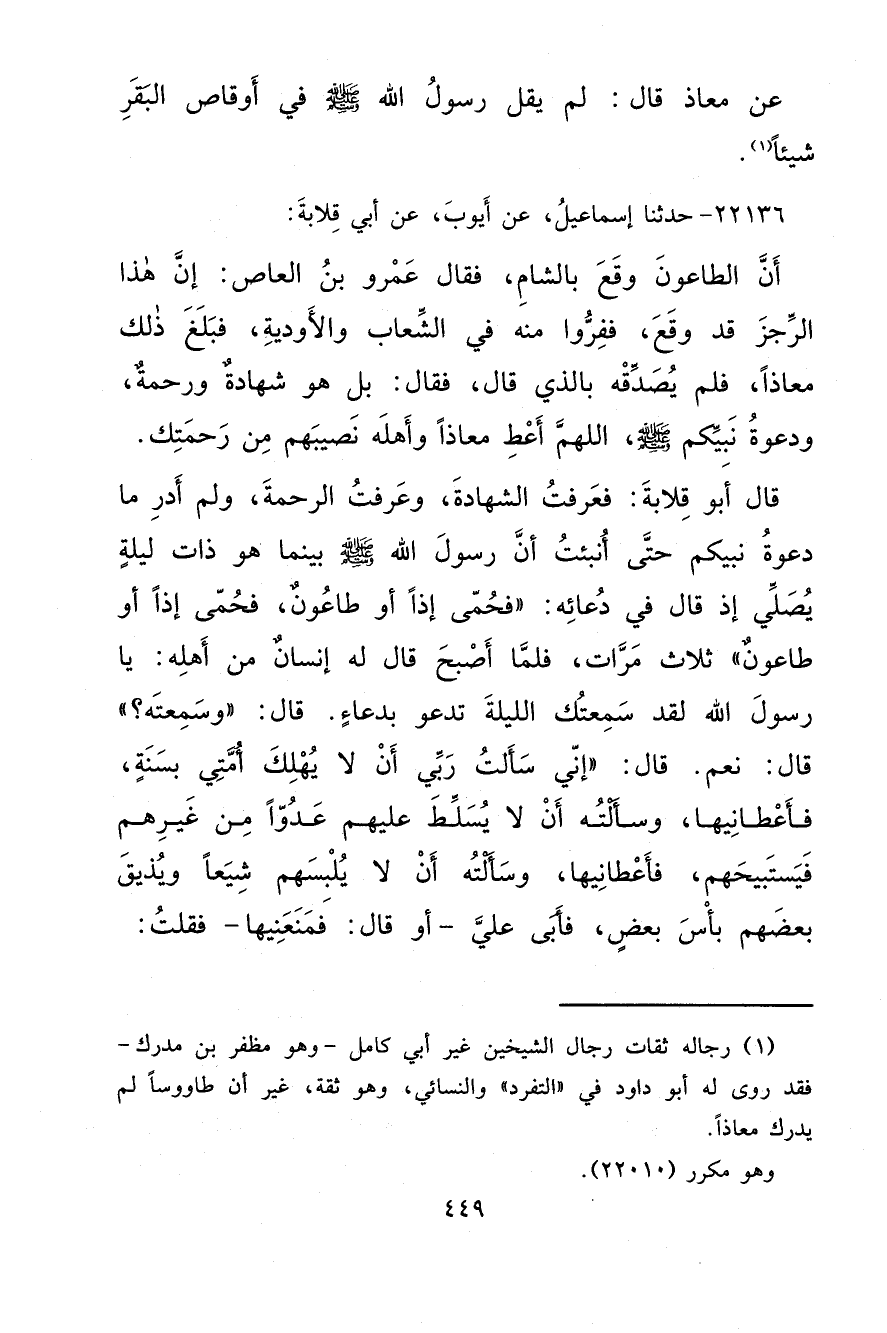 ٢٢١٣٦ - حَدَّثَنَا إِسْمَاعِيلُ، عَنْ أَيُّوبَ، عَنْ أَبِي قِلَابَةَ، أَنَّ الطَّاعُونَ وَقَعَ بِالشَّامِ، فَقَالَ عَمْرُو بْنُ الْعَاصِ: إِنَّ هَذَا الرِّجْزَ قَدْ وَقَعَ فَفِرُّوا مِنْهُ فِي الشِّعَابِ وَالْأَوْدِيَةِ، فَبَلَغَ ذَلِكَ مُعَاذًا فَلَمْ يُصَدِّقْهُ بِالَّذِي قَالَ فَقَالَ: بَلْ هُوَ شَهَادَةٌ وَرَحْمَةٌ وَدَعْوَةُ نَبِيِّكُمْ صَلَّى اللهُ عَلَيْهِ وَسَلَّمَ اللهُمَّ أَعْطِ مُعَاذًا وَأَهْلَهُ نَصِيبَهُمْ مِنْ رَحْمَتِكَ. قَالَ أَبُو قِلَابَةَ: فَعَرَفْتُ الشَّهَادَةَ وَعَرَفْتُ الرَّحْمَةَ وَلَمْ أَدْرِ مَا دَعْوَةُ نَبِيِّكُمْ حَتَّى أُنْبِئْتُ أَنَّ رَسُولَ اللهِ صَلَّى اللهُ عَلَيْهِ وَسَلَّمَ، بَيْنَمَا هُوَ ذَاتَ لَيْلَةٍ يُصَلِّي إِذْ قَالَ فِي دُعَائِهِ: " فَحُمَّى إِذًا أَوْ طَاعُونٌ، فَحُمَّى إِذًا أَوْ طَاعُونٌ ". ثَلَاثَ مَرَّاتٍ، فَلَمَّا أَصْبَحَ قَالَ لَهُ إِنْسَانٌ مِنْ أَهْلِهِ: يَا رَسُولَ اللهِ، لَقَدْ سَمِعْتُكَ اللَّيْلَةَ تَدْعُو بِدُعَاءٍ. قَالَ: " وَسَمِعْتَهُ؟ " قَالَ: نَعَمْ. قَالَ: " إِنِّي سَأَلْتُ رَبِّي أَنْ لَا يُهْلِكَ أُمَّتِي بِسَنَةٍ فَأَعْطَانِيهَا، وَسَأَلْتُهُ أَنْ لَا يُسَلِّطَ عَلَيْهِمْ عَدُوًّا مِنْ غَيْرِهِمْ فَيَسْتَبِيحَهُمْ فَأَعْطَانِيهَا، وَسَأَلْتُهُ أَنْ لَا يُلْبِسَهُمْ شِيَعًا، وَيُذِيقَ بَعْضَهُمْ بَأْسَ بَعْضٍ فَأَبَى عَلَيَّ، أَوْ قَالَ فَمَنَعَنِيهَا، فَقُلْتُ: