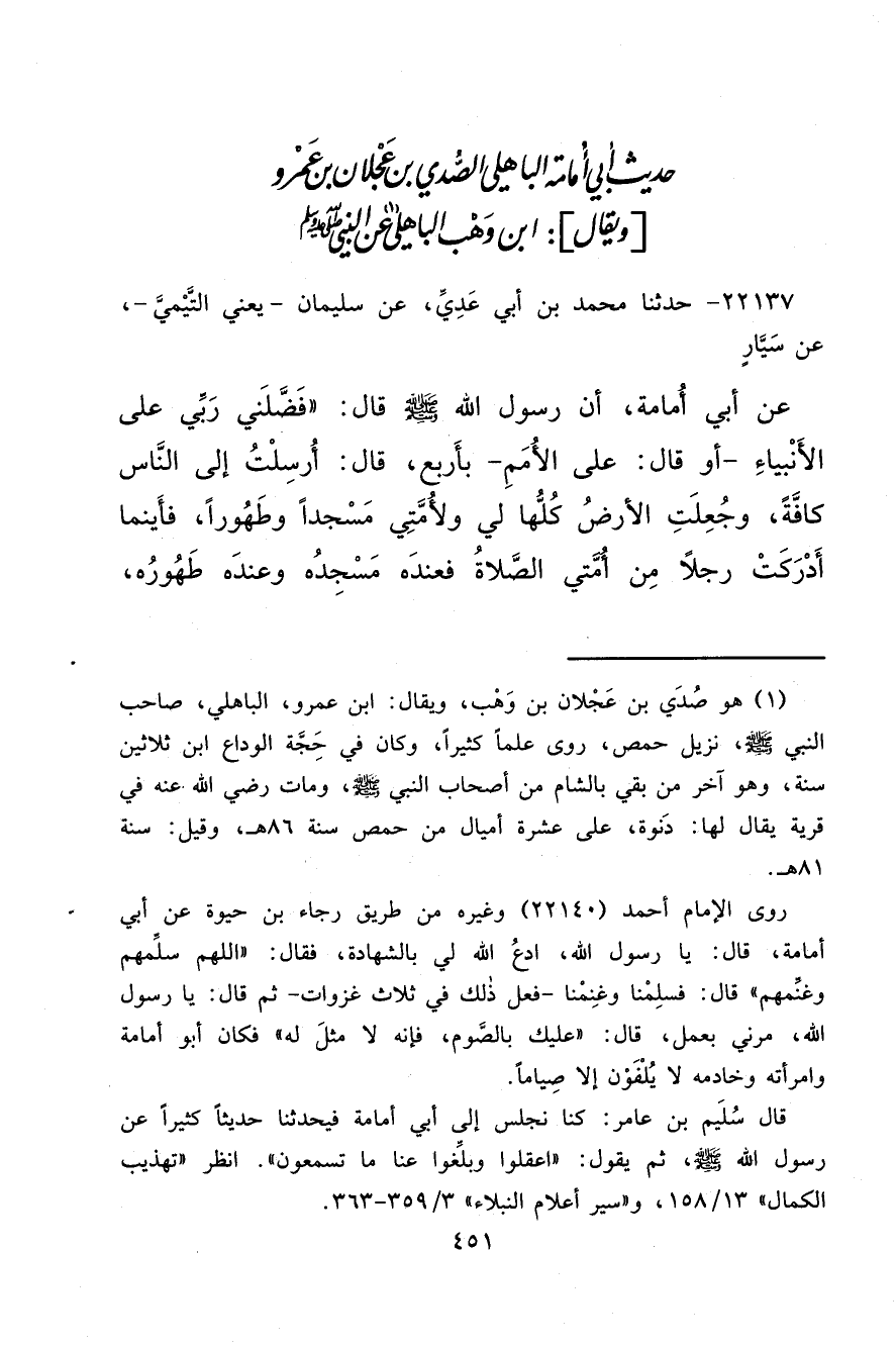 حَدِيثُ أَبِي أُمَامَةَ الْبَاهِلِيِّ الصُّدَيِّ بْنِ عَجْلَانَ بْنِ عَمْرِو وَيُقَالُ: ابْنُ وَهْبٍ الْبَاهِلِيِّ، (١) عَنِ النَّبِيِّ صَلَّى اللهُ عَلَيْهِ وَسَلَّمَ