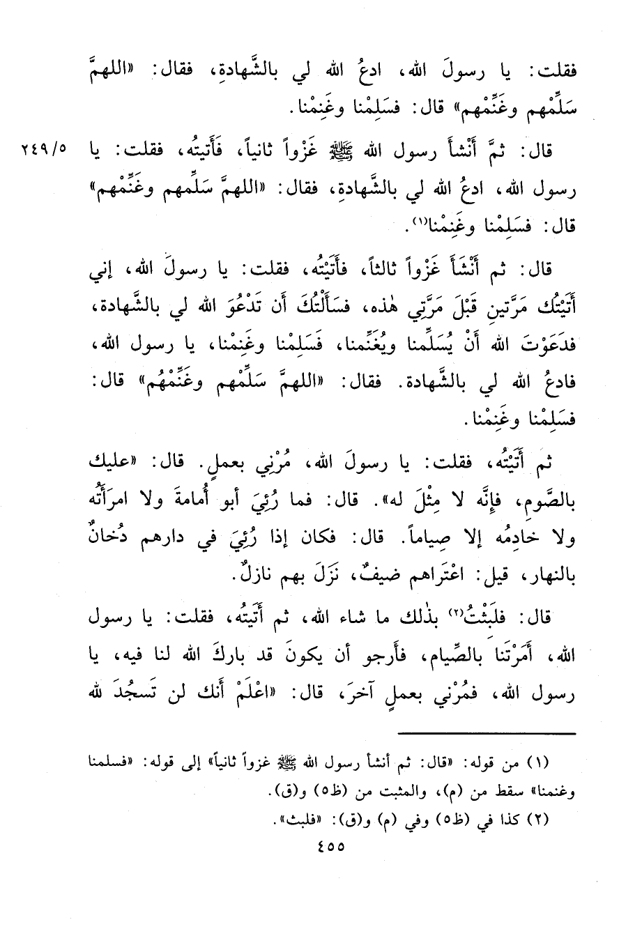 فَقُلْتُ: يَا رَسُولَ اللهِ، ادْعُ اللهَ لِي بِالشَّهَادَةِ. فَقَالَ: " اللهُمَّ سَلِّمْهُمْ وَغَنِّمْهُمْ ". قَالَ: فَسَلِمْنَا وَغَنِمْنَا. قَالَ: ثُمَّ أَنْشَأَ رَسُولُ اللهِ صَلَّى اللهُ عَلَيْهِ وَسَلَّمَ غَزْوًا ثَانِيًا، فَأَتَيْتُهُ فَقُلْتُ: يَا رَسُولَ اللهِ، ادْعُ اللهَ لِي بِالشَّهَادَةِ. فَقَالَ: " اللهُمَّ سَلِّمْهُمْ وَغَنِّمْهُمْ ". قَالَ: فَسَلَّمْنَا وَغَنِمْنَا (١) . قَالَ: ثُمَّ أَنْشَأَ غَزْوًا ثَالِثًا، فَأَتَيْتُهُ فَقُلْتُ: يَا رَسُولَ اللهِ، إِنِّي أَتَيْتُكَ مَرَّتَيْنِ قَبْلَ مَرَّتِي هَذِهِ فَسَأَلْتُكَ أَنْ تَدْعُوَ اللهَ لِي بِالشَّهَادَةِ، فَدَعَوْتَ اللهَ أَنْ يُسَلِّمَنَا وَيُغَنِّمَنَا فَسَلِمْنَا وَغَنِمْنَا. يَا رَسُولَ اللهِ، فَادْعُ اللهَ لِي بِالشَّهَادَةِ. فَقَالَ: " اللهُمَّ سَلِّمْهُمْ وَغَنِّمْهُمْ ". قَالَ: فَسَلِمْنَا وَغَنِمْنَا، ثُمَّ أَتَيْتُهُ فَقُلْتُ: يَا رَسُولَ اللهِ، مُرْنِي بِعَمَلٍ. قَالَ: " عَلَيْكَ بِالصَّوْمِ؛ فَإِنَّهُ لَا مِثْلَ لَهُ ". قَالَ: فَمَا رُئِيَ أَبُو أُمَامَةَ وَلَا امْرَأَتُهُ وَلَا خَادِمُهُ إِلَّا صُيَّامًا. قَالَ: فَكَانَ إِذَا رُئِيَ فِي دَارِهِمْ دُخَانٌ بِالنَّهَارِ قِيلَ اعْتَرَاهُمْ ضَيْفٌ نَزَلَ بِهِمْ نَازِلٌ. قَالَ: فَلَبِثْتٌ (٢) بِذَلِكَ مَا شَاءَ اللهُ، ثُمَّ أَتَيْتُهُ فَقُلْتُ: يَا رَسُولَ اللهِ، أَمَرْتَنَا بِالصِّيَامِ فَأَرْجُو أَنْ يَكُونَ قَدْ بَارَكَ اللهُ لَنَا فِيهِ يَا رَسُولَ اللهِ، فَمُرْنِي بِعَمَلٍ آخَرَ قَالَ: " اعْلَمْ أَنَّكَ لَنْ تَسْجُدَ لِلَّهِ