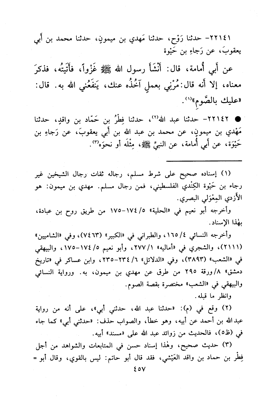 • ٢٢١٤٢ - حَدَّثَنَا عَبْدُ اللهِ، (٢) حَدَّثَنَا فِطْرُ بْنُ حَمَّادِ بْنِ وَاقِدٍ، حَدَّثَنَا مَهْدِيُّ بْنُ مَيْمُونٍ، عَنْ مُحَمَّدِ بْنِ عَبْدِ اللهِ بْنِ أَبِي يَعْقُوبَ، عَنِ رَجَاءِ بْنِ حَيْوَةَ، عَنْ أَبِي أُمَامَةَ، عَنِ النَّبِيِّ صَلَّى اللهُ عَلَيْهِ وَسَلَّمَ مِثْلَهُ أَوْ نَحْوَهُ (٣)
