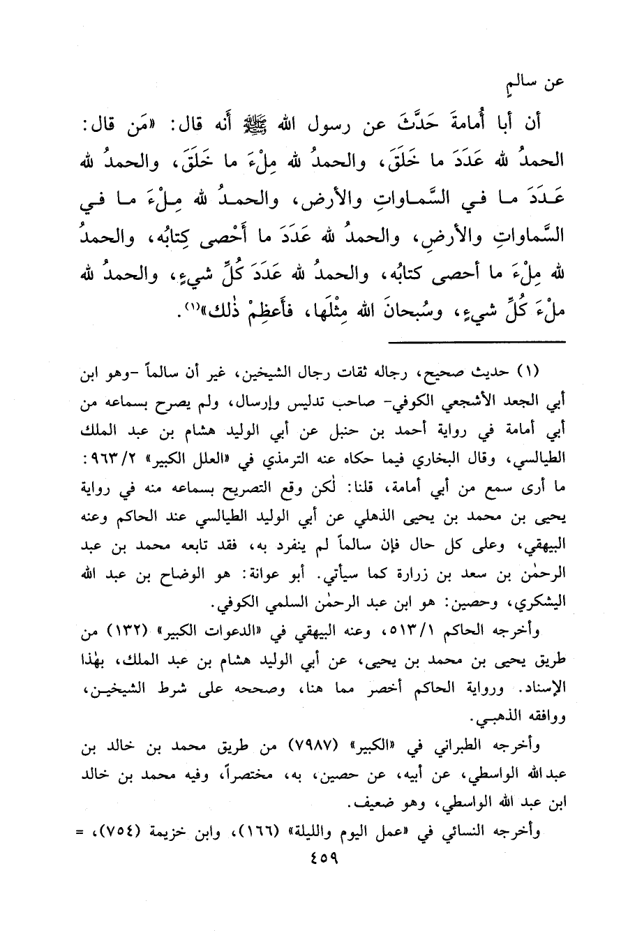 عَنْ سَالِمٍ، أَنَّ أَبَا أُمَامَةَ حَدَّثَ، عَنْ رَسُولِ اللهِ صَلَّى اللهُ عَلَيْهِ وَسَلَّمَ أَنَّهُ قَالَ: " مَنْ قَالَ: الْحَمْدُ لِلَّهِ عَدَدَ مَا خَلَقَ، وَالْحَمْدُ لِلَّهِ مِلْءَ مَا خَلَقَ، وَالْحَمْدُ لِلَّهِ عَدَدَ مَا فِي السَّمَاوَاتِ وَالْأَرْضِ، وَالْحَمْدُ لِلَّهِ مِلْءَ مَا فِي السَّمَاوَاتِ وَالْأَرْضِ، وَالْحَمْدُ لِلَّهِ عَدَدَ مَا أَحْصَى كِتَابُهُ، وَالْحَمْدُ لِلَّهِ مِلْءَ مَا أَحْصَى كِتَابُهُ، وَالْحَمْدُ لِلَّهِ عَدَدَ كُلِّ شَيْءٍ، وَالْحَمْدُ لِلَّهِ مِلْءَ كُلِّ شَيْءٍ، وَسُبْحَانَ اللهِ مِثْلَهَا فَأَعْظِمْ ذَلِكَ " (١)