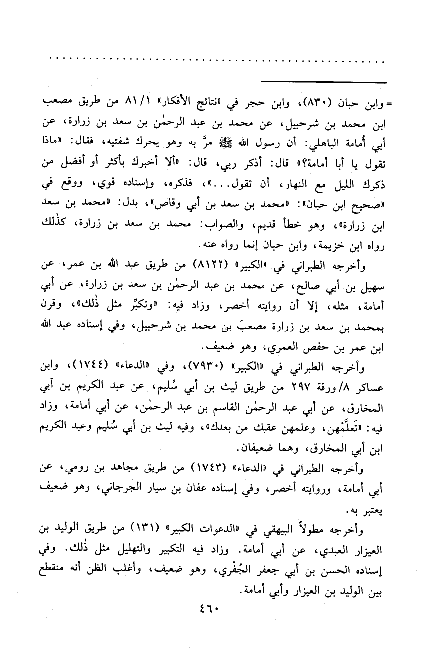 = وابن حبان (٨٣٠) ، وابن حجر في "نتائج الأفكار" ١/٨١ من طريق مصعب ابن محمد بن شرحبيل، عن محمد بن عبد الرحمن بن سعد بن زرارة، عن أبي أُمامة الباهلي: أن رسول الله صَلَّى اللهُ عَلَيْهِ وَسَلَّمَ مرَّ به وهو يحرك شفتيه، فقال: "ماذا تقول يا أبا أمامة؟ " قال: أذكر ربي، قال: "ألا أخبرك بأكثر أو أفضل من ذكرك الليل مع النهار، أن تقول ... "، فذكره، وإسناده قوي، ووقع في "صحيح ابن حبان": "محمد بن سعد بن أبي وقاص"، بدل: "محمد بن سعد ابن زرارة"، وهو خطأ قديم، والصواب: محمد بن سعد بن زرارة، كذلك رواه ابن خزيمة، وابن حبان إنما رواه عنه.