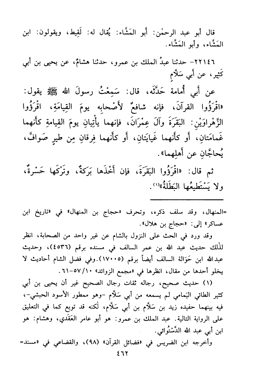 ٢٢١٤٦ - حَدَّثَنَا عَبْدُ الْمَلِكِ بْنُ عَمْرٍو، حَدَّثَنَا هِشَامٌ، عَنْ يَحْيَى بْنِ أَبِي كَثِيرٍ، عَنْ أَبِي سَلَّامٍ، عَنْ أَبِي أُمَامَةَ حَدَّثَهُ قَالَ: سَمِعْتُ رَسُولَ اللهِ صَلَّى اللهُ عَلَيْهِ وَسَلَّمَ يَقُولُ: " اقْرَءُوا الْقُرْآنَ؛ فَإِنَّهُ شَافِعٌ لِأَصْحَابِهِ يَوْمَ الْقِيَامَةِ اقْرَءُوا الزَّهْرَاوَيْنِ: الْبَقَرَةَ، وَآلَ عِمْرَانَ؛ فَإِنَّهُمَا يَأْتِيَانِ يَوْمَ الْقِيَامَةِ كَأَنَّهُمَا غَمَامَتَانِ، أَوْ كَأَنَّهُمَا غَيَايَتَانِ، أَوْ كَأَنَّهُمَا فِرْقَانِ مِنْ طَيْرٍ صَوَافَّ يُحَاجَّانِ عَنْ أَهْلِهِمَا ". ثُمَّ قَالَ: " اقْرَءُوا الْبَقَرَةَ؛ فَإِنَّ أَخْذَهَا بَرَكَةٌ وَتَرْكَهَا حَسْرَةٌ وَلَا يَسْتَطِيعُهَا الْبَطَلَةُ " (١)