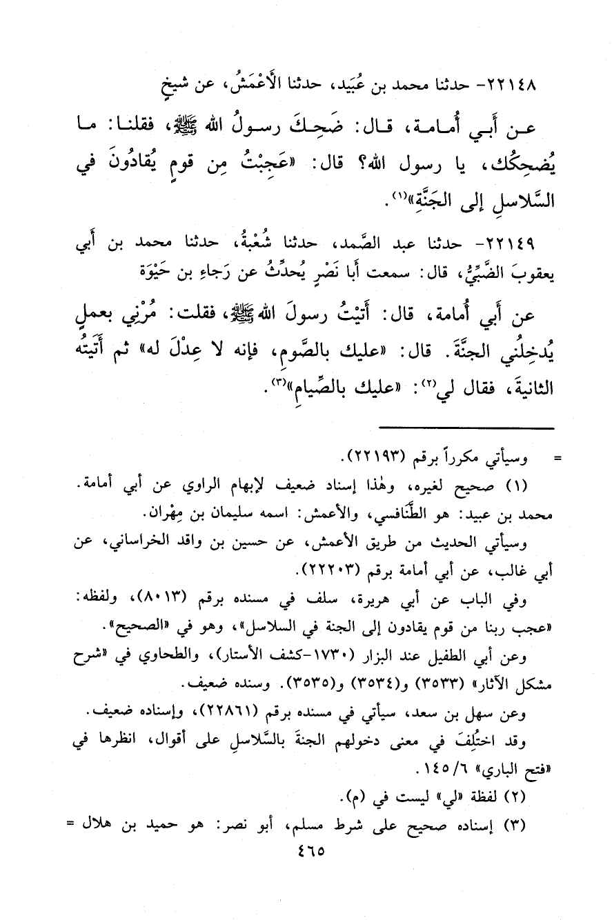 ٢٢١٤٨ - حَدَّثَنَا مُحَمَّدُ بْنُ عُبَيْدٍ، حَدَّثَنَا الْأَعْمَشُ، عَنْ شَيْخٍ، عَنْ أَبِي أُمَامَةَ قَالَ: ضَحِكَ رَسُولُ اللهِ صَلَّى اللهُ عَلَيْهِ وَسَلَّمَ فَقُلْنَا: مَا يُضْحِكُكَ يَا رَسُولَ اللهِ؟ قَالَ: " عَجِبْتُ مِنْ قَوْمٍ يُقَادُونَ فِي السَّلَاسِلِ إِلَى الْجَنَّةِ " (١)
