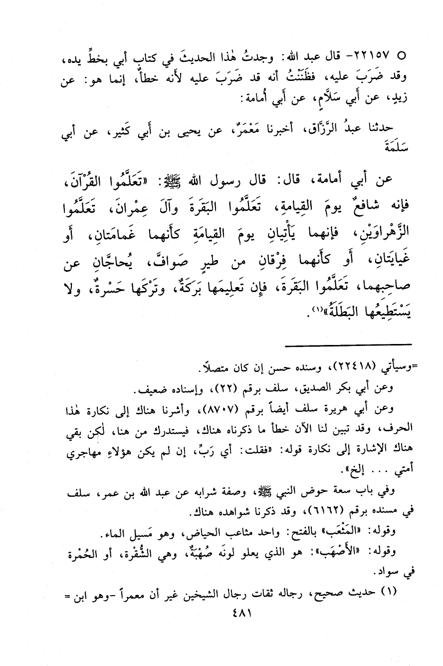 ° ٢٢١٥٧ - قَالَ عَبْدُ اللهِ: وَجَدْتُ هَذَا الْحَدِيثَ فِي كِتَابِ أَبِي بِخَطِّ يَدِهِ وَقَدْ ضَرَبَ عَلَيْهِ فَظَنَنْتُ أَنَّهُ قَدْ ضَرَبَ عَلَيْهِ؛ لِأَنَّهُ خَطَأٌ إِنَّمَا هُوَ عَنْ زَيْدٍ، عَنْ أَبِي سَلَّامٍ، عَنْ أَبِي أُمَامَةَ، حَدَّثَنَا عَبْدُ الرَّزَّاقِ، أَخْبَرَنَا مَعْمَرٌ، عَنْ يَحْيَى بْنِ أَبِي كَثِيرٍ، عَنْ أَبِي سَلَمَةَ، عَنْ أَبِي أُمَامَةَ قَالَ: قَالَ رَسُولُ اللهِ صَلَّى اللهُ عَلَيْهِ وَسَلَّمَ: " تَعَلَّمُوا الْقُرْآنَ؛ فَإِنَّهُ شَافِعٌ يَوْمَ الْقِيَامَةِ، تَعَلَّمُوا الْبَقَرَةَ وَآلَ عِمْرَانَ تَعَلَّمُوا الزَّهْرَاوَيْنِ؛ فَإِنَّهُمَا يَأْتِيَانِ يَوْمَ الْقِيَامَةِ كَأَنَّهُمَا غَمَامَتَانِ أَوْ غَيَايَتَانِ أَوْ كَأَنَّهُمَا فِرْقَانِ مِنْ طَيْرٍ صَوَافَّ يُحَاجَّانِ عَنْ صَاحِبِهِمَا تَعَلَّمُوا الْبَقَرَةَ؛ فَإِنَّ تَعْلِيمَهَا بَرَكَةٌ وَتَرْكَهَا حَسْرَةٌ وَلَا يَسْتَطِيعُهَا الْبَطَلَةُ " (١)