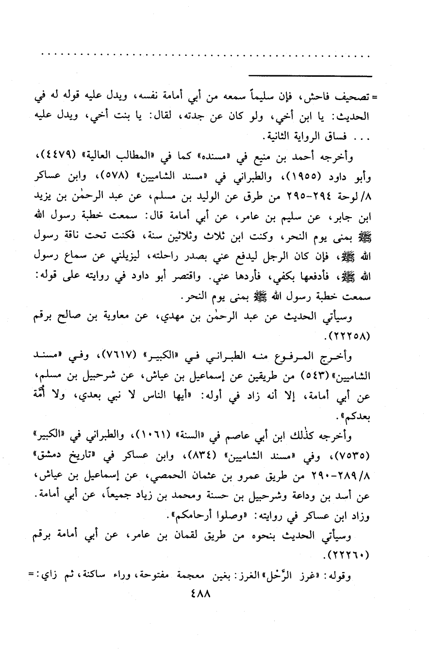 = تصحيف فاحش، فإن سليماً سمعه من أبي أمامة نفسه، ويدل عليه قوله له في الحديث: يا ابن أخي، ولو كان عن جدته، لقال: يا بنت أخي، ويدل عليه ... فساق الرواية الثانية.