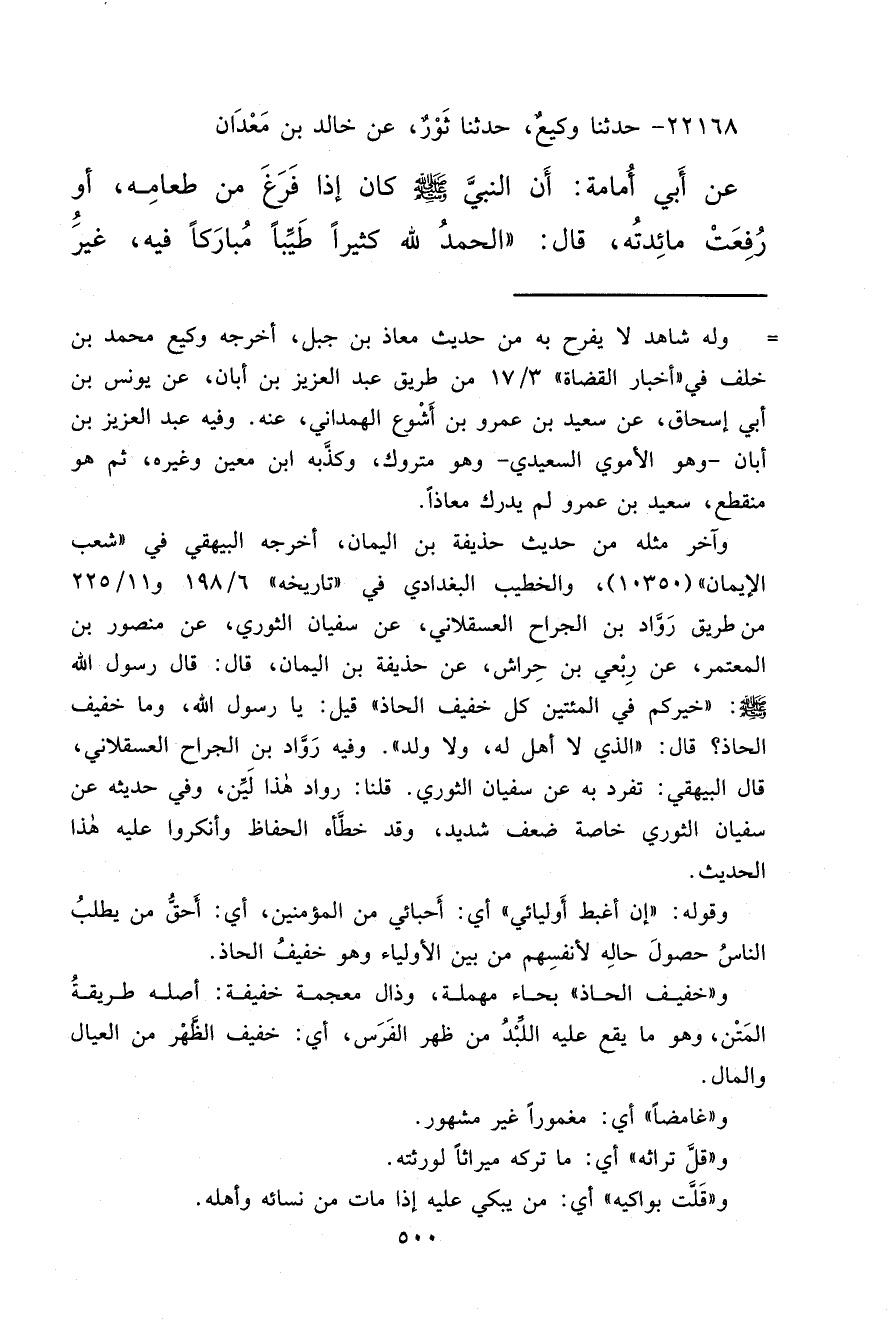 ٢٢١٦٨ - حَدَّثَنَا وَكِيعٌ، حَدَّثَنَا ثَوْرٌ، عَنْ خَالِدِ بْنِ مَعْدَانَ، عَنْ أَبِي أُمَامَةَ، أَنَّ النَّبِيَّ صَلَّى اللهُ عَلَيْهِ وَسَلَّمَ كَانَ إِذَا فَرَغَ مِنْ طَعَامِهِ أَوْ رُفِعَتْ مَائِدَتُهُ قَالَ: " الْحَمْدُ لِلَّهِ كَثِيرًا طَيِّبًا مُبَارَكًا فِيهِ غَيْرَ