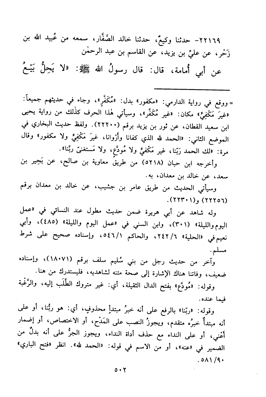 ٢٢١٦٩ - حَدَّثَنَا وَكِيعٌ، حَدَّثَنَا خَلَّادٌ الصَّفَّارُ، سَمِعَهُ مِنْ عُبَيْدِ اللهِ بْنِ زَحْرٍ، عَنْ عَلِيِّ بْنِ يَزِيدَ، عَنِ الْقَاسِمِ بْنِ عَبْدِ الرَّحْمَنِ، عَنْ أَبِي أُمَامَةَ قَالَ: قَالَ رَسُولُ اللهِ صَلَّى اللهُ عَلَيْهِ وَسَلَّمَ: " لَا يَحِلُّ بَيْعُ