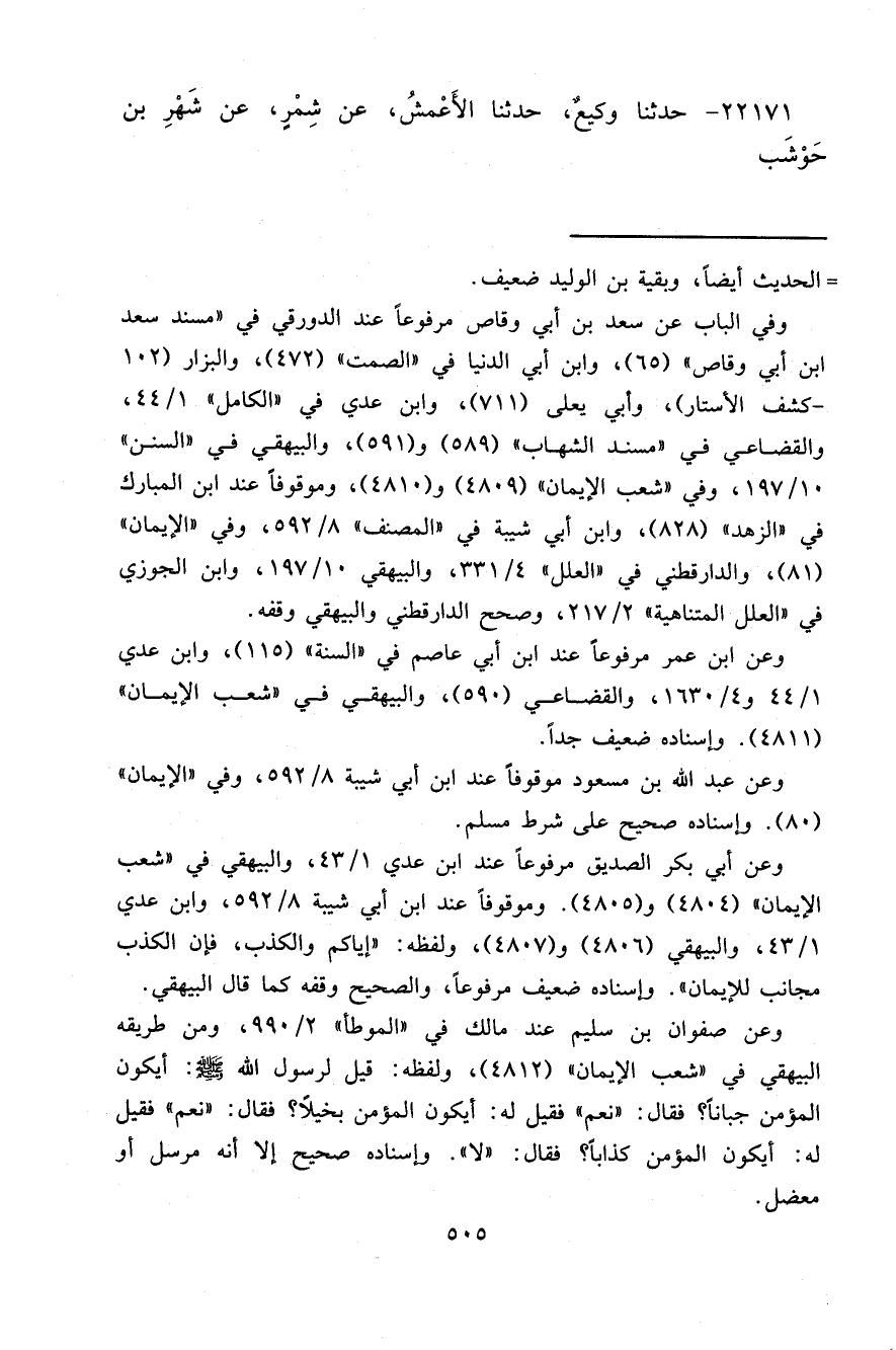 ٢٢١٧١ - حَدَّثَنَا وَكِيعٌ، حَدَّثَنَا الْأَعْمَشُ، عَنْ شِمْرٍ، عَنْ شَهْرِ بْنِ حَوْشَبٍ،