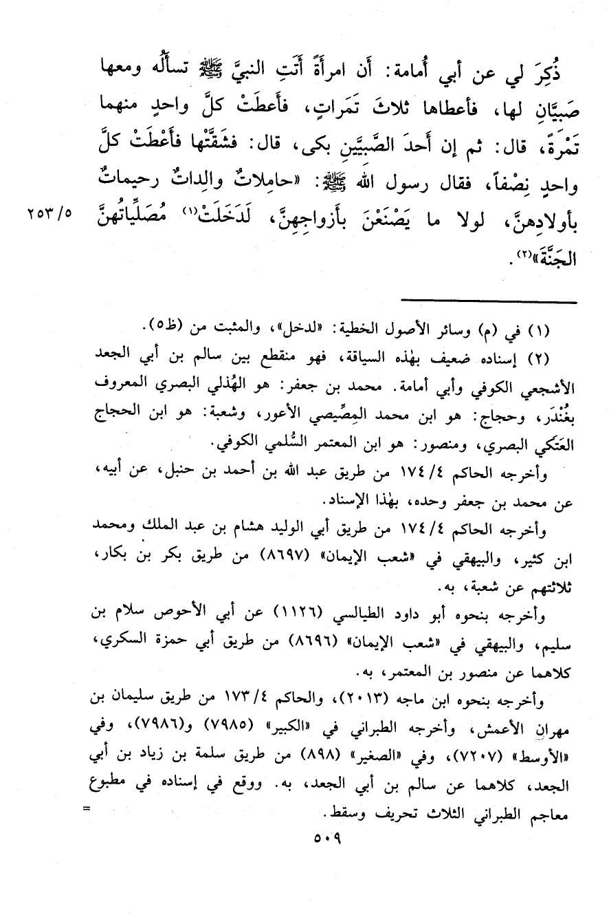 ذُكِرَ لِي عَنْ أَبِي أُمَامَةَ، أَنَّ امْرَأَةً، أَتَتِ النَّبِيَّ صَلَّى اللهُ عَلَيْهِ وَسَلَّمَ تَسْأَلُهُ وَمَعَهَا صَبِيَّانِ لَهَا فَأَعْطَاهَا ثَلَاثَ تَمَرَاتٍ، فَأَعْطَتْ كُلَّ وَاحِدٍ مِنْهُمَا تَمْرَةً. قَالَ: ثُمَّ إِنَّ أَحَدَ الصَّبِيَّيْنِ بَكَى قَالَ: فَشَقَّتْهَا فَأَعْطَتْ كُلَّ وَاحِدٍ نِصْفًا. فَقَالَ رَسُولُ اللهِ صَلَّى اللهُ عَلَيْهِ وَسَلَّمَ: " حَامِلَاتٌ وَالِدَاتٌ رَحِيمَاتٌ بِأَوْلَادِهِنَّ لَوْلَا مَا يَصْنَعْنَ بِأَزْوَاجِهِنَّ لَدَخَلَتْ (١) مُصَلِّيَاتُهُنَّ الْجَنَّةَ " (٢)