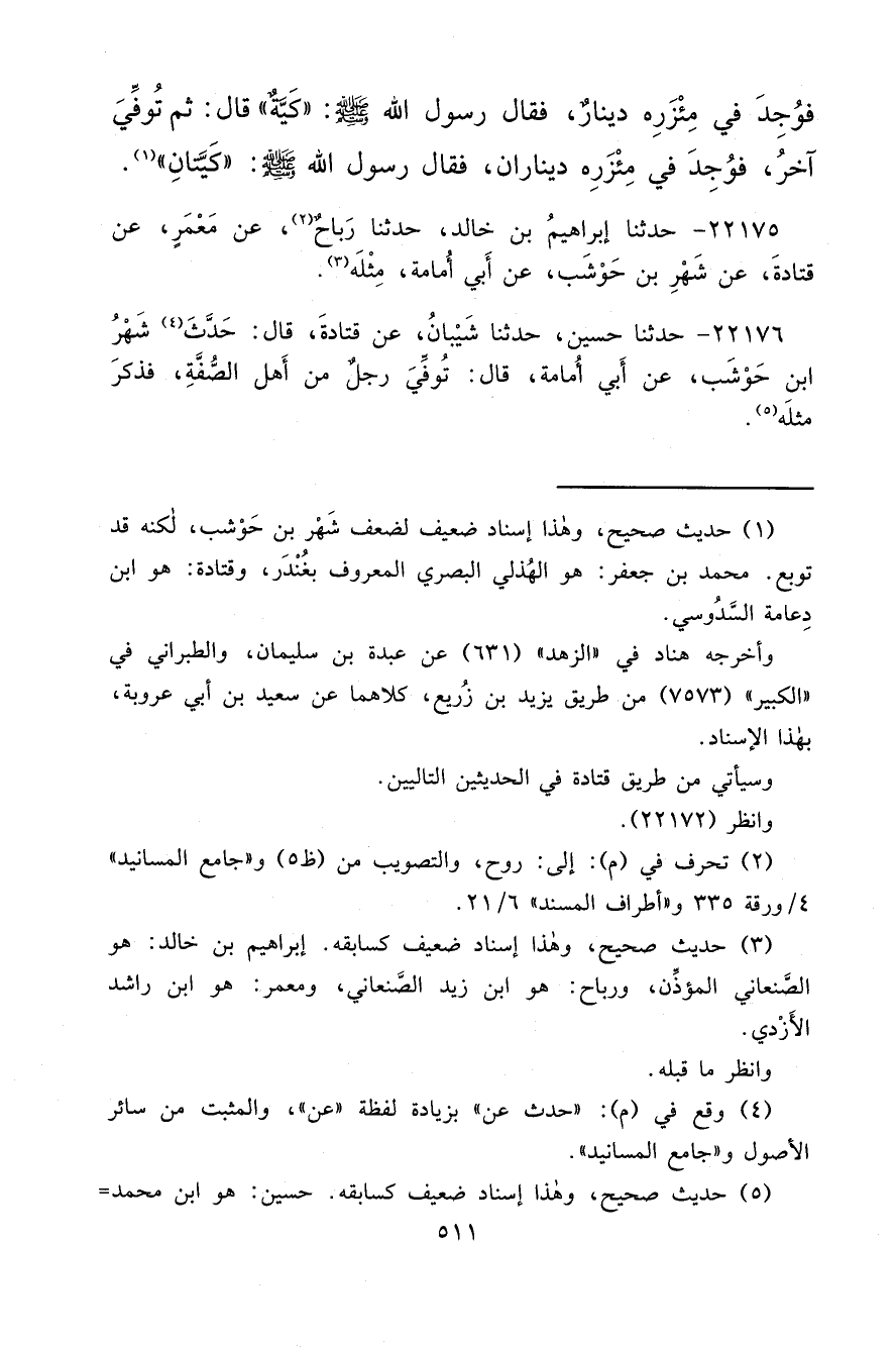 ٢٢١٧٦ - حَدَّثَنَا حُسَيْنٌ، حَدَّثَنَا شَيْبَانُ، عَنْ قَتَادَةَ قَالَ: حَدَّثَ (٤) شَهْرِ بْنِ حَوْشَبٍ، عَنْ أَبِي أُمَامَةَ قَالَ: تُوُفِّيَ رَجُلٌ مِنْ أَهْلِ الصُّفَّةِ فَذَكَرَ مِثْلَهُ (٥)