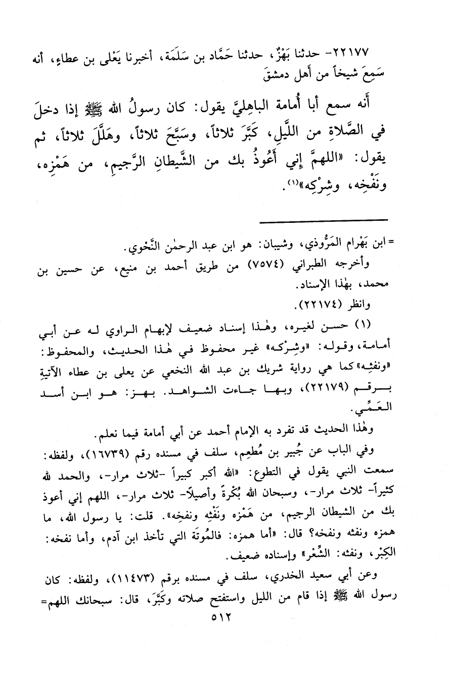 ٢٢١٧٧ - حَدَّثَنَا بَهْزٌ، حَدَّثَنَا حَمَّادُ بْنُ سَلَمَةَ، أَخْبَرَنَا يَعْلَى بْنُ عَطَاءٍ، أَنَّهُ سَمِعَ شَيْخًا مِنْ أَهْلِ دِمَشْقَ، أَنَّهُ سَمِعَ أَبَا أُمَامَةَ الْبَاهِلِيَّ يَقُولُ: كَانَ رَسُولُ اللهِ صَلَّى اللهُ عَلَيْهِ وَسَلَّمَ إِذَا دَخَلَ فِي الصَّلَاةِ مِنَ اللَّيْلِ كَبَّرَ ثَلَاثًا، وَسَبَّحَ ثَلَاثًا، وَهَلَّلَ ثَلَاثًا، ثُمَّ يَقُولُ: " اللهُمَّ إِنِّي أَعُوذُ بِكَ مِنَ الشَّيْطَانِ الرَّجِيمِ مِنْ هَمْزِهِ وَنَفْخِهِ وَشِرْكِهِ " (١)