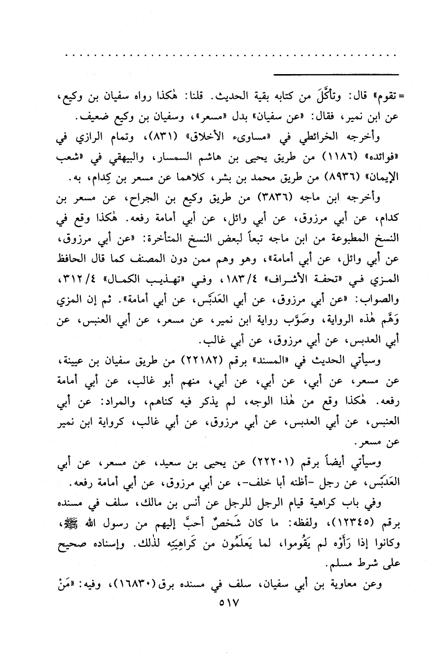 = تقوم" قال: وتأكَّلَ من كتابه بقية الحديث. قلنا: هكذا رواه سفيان بن وكيع، عن ابن نمير، فقال: "عن سفيان" بدل "مسعر"، وسفيان بن وكيع ضعيف.