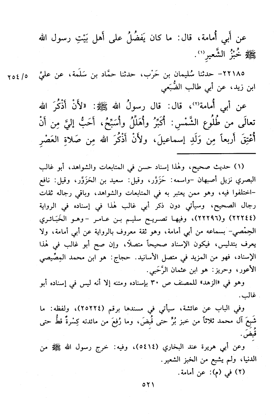 ٢٢١٨٥ - حَدَّثَنَا سُلَيْمَانُ بْنُ حَرْبٍ، حَدَّثَنَا حَمَّادُ بْنُ سَلَمَةَ، عَنْ عَلِيِّ بْنِ زَيْدٍ، عَنْ أَبِي طَالِبٍ الضُّبَعِيِّ، عَنْ أَبِي أُمَامَةَ (٢) قَالَ: قَالَ رَسُولُ اللهِ صَلَّى اللهُ عَلَيْهِ وَسَلَّمَ: " لَأَنْ أَذْكُرَ اللهَ تَعَالَى مِنْ طُلُوعِ الشَّمْسِ أُكَبِّرُ وَأُهَلِّلُ وَأُسَبِّحُ، أَحَبُّ إِلَيَّ مِنْ أَنْ أَعْتِقَ أَرْبَعًا مِنْ وَلَدِ إِسْمَاعِيلَ، وَلَأَنْ أَذْكُرَ اللهَ مِنْ صَلَاةِ الْعَصْرِ