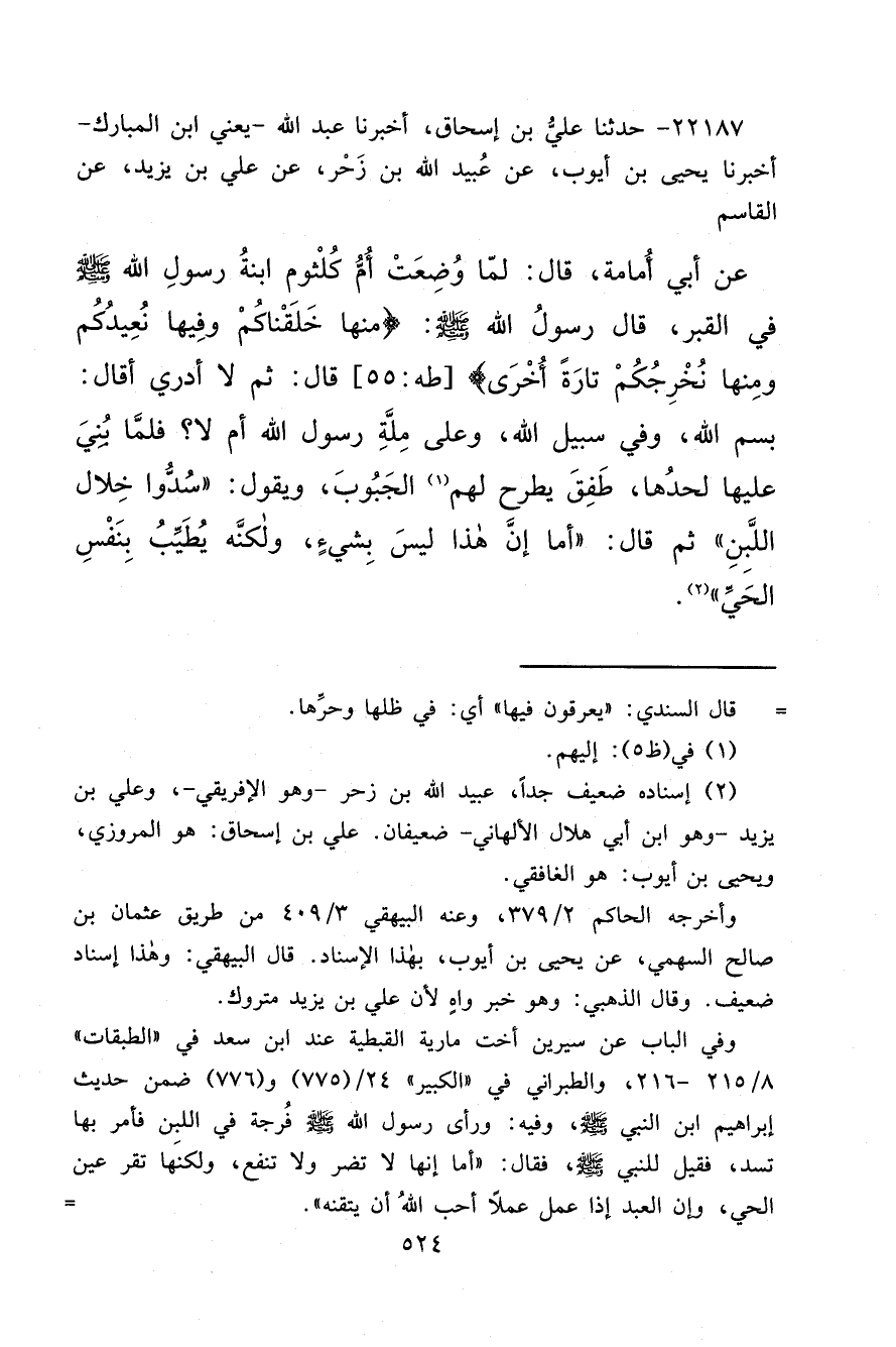 ٢٢١٨٧ - حَدَّثَنَا عَلِيُّ بْنُ إِسْحَاقَ، أَخْبَرَنَا عَبْدُ اللهِ يَعْنِي ابْنَ الْمُبَارَكِ، أَخْبَرَنَا يَحْيَى بْنُ أَيُّوبَ، عَنْ عُبَيْدِ اللهِ بْنِ زَحْرٍ، عَنْ عَلِيِّ بْنِ يَزِيدَ، عَنِ الْقَاسِمِ، عَنْ أَبِي أُمَامَةَ قَالَ: لَمَّا وُضِعَتْ أُمُّ كُلْثُومٍ ابْنَةُ رَسُولِ اللهِ صَلَّى اللهُ عَلَيْهِ وَسَلَّمَ فِي الْقَبْرِ. قَالَ رَسُولُ اللهِ صَلَّى اللهُ عَلَيْهِ وَسَلَّمَ: " {مِنْهَا خَلَقْنَاكُمْ وَفِيهَا نُعِيدُكُمْ، وَمِنْهَا نُخْرِجُكُمْ تَارَةً أُخْرَى} [طه: ٥٥] "، قَالَ: ثُمَّ لَا أَدْرِي أَقَالَ: بِسْمِ اللهِ وَفِي سَبِيلِ اللهِ وَعَلَى مِلَّةِ رَسُولِ اللهِ؟ أَمْ لَا، فَلَمَّا بَنَى عَلَيْهَا لَحْدَهَا طَفِقَ يَطْرَحُ لَهُمُ (١) الْجَبُوبَ وَيَقُولُ: " سُدُّوا خِلَالَ اللَّبِنِ ". ثُمَّ قَالَ: " أَمَا إِنَّ هَذَا لَيْسَ بِشَيْءٍ وَلَكِنَّهُ يَطِيبُ بِنَفْسِ الْحَيِّ " (٢)