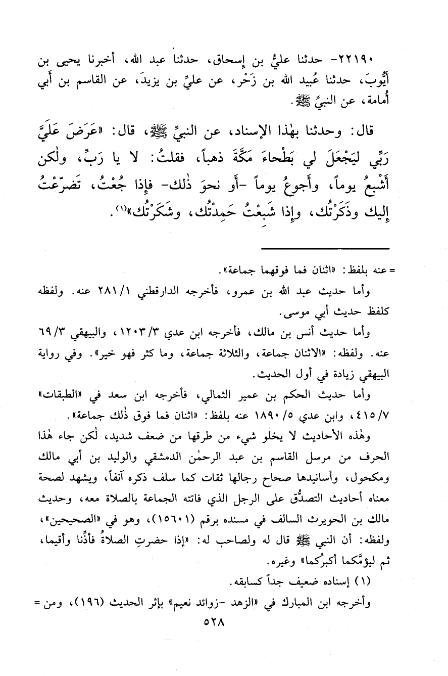 ٢٢١٩٠ - حَدَّثَنَا عَلِيُّ بْنُ إِسْحَاقَ، حَدَّثَنَا عَبْدُ اللهِ، أَخْبَرَنَا يَحْيَى بْنُ أَيُّوبَ، حَدَّثَنَا عُبَيْدُ اللهِ بْنُ زَحْرٍ، عَنْ عَلِيِّ بْنِ يَزِيدَ، عَنِ الْقَاسِمِ، عَنْ أَبِي أُمَامَةَ عَنِ النَّبِيِّ صَلَّى اللهُ عَلَيْهِ وَسَلَّمَ قَالَ: وَحُدِّثْنَا بِهَذَا الْإِسْنَادِ عَنِ النَّبِيِّ صَلَّى اللهُ عَلَيْهِ وَسَلَّمَ قَالَ: " عَرَضَ عَلَيَّ رَبِّي لِيَجْعَلَ لِي بَطْحَاءَ مَكَّةَ ذَهَبًا. فَقُلْتُ: لَا. يَا رَبِّ وَلَكِنْ أَشْبَعُ يَوْمًا وَأَجُوعُ يَوْمًا، أَوْ نَحْوَ ذَلِكَ، فَإِذَا جُعْتُ تَضَرَّعْتُ إِلَيْكَ وَذَكَرْتُكَ، وَإِذَا شَبِعْتُ حَمِدْتُكَ وَشَكَرْتُكَ " (١)