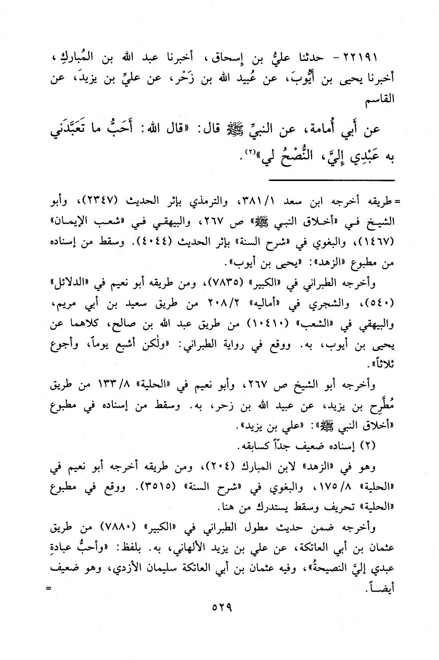 ٢٢١٩١ - حَدَّثَنَا عَلِيُّ بْنُ إِسْحَاقَ، أَخْبَرَنَا عَبْدُ اللهِ بْنُ الْمُبَارَكِ، أَخْبَرَنَا يَحْيَى بْنُ أَيُّوبَ، عَنْ عُبَيْدِ اللهِ بْنِ زَحْرٍ، عَنْ عَلِيِّ بْنِ يَزِيدَ، عَنِ الْقَاسِمِ، عَنْ أَبِي أُمَامَةَ عَنِ النَّبِيِّ صَلَّى اللهُ عَلَيْهِ وَسَلَّمَ قَالَ: قَالَ اللهُ: " أَحَبُّ مَا تَعَبَّدَنِي بِهِ عَبْدِي إِلَيَّ: النُّصْحُ لِي " (١)