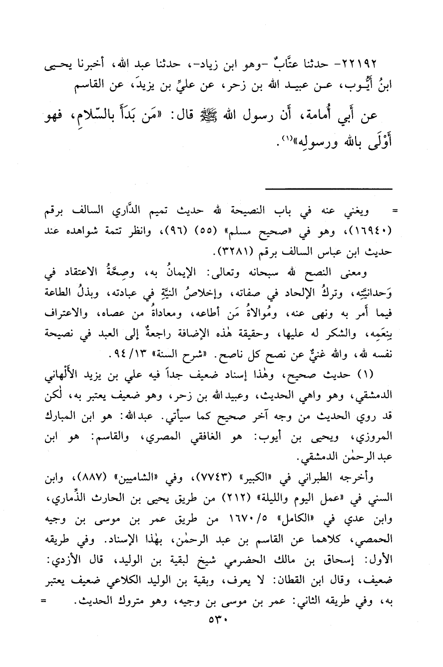 ٢٢١٩٢ - حَدَّثَنَا عَتَّابٌ وَهُوَ ابْنُ زِيَادٍ، حَدَّثَنَا عَبْدُ اللهِ، أَخْبَرَنَا يَحْيَى بْنُ أَيُّوبَ، عَنْ عُبَيْدِ اللهِ بْنِ زَحْرٍ، عَنْ عَلِيِّ بْنِ يَزِيدَ، عَنِ الْقَاسِمِ، عَنْ أَبِي أُمَامَةَ أَنَّ رَسُولَ اللهِ صَلَّى اللهُ عَلَيْهِ وَسَلَّمَ قَالَ: " مَنْ بَدَأَ بِالسَّلَامِ فَهُوَ أَوْلَى بِاللهِ وَرَسُولِهِ " (١)