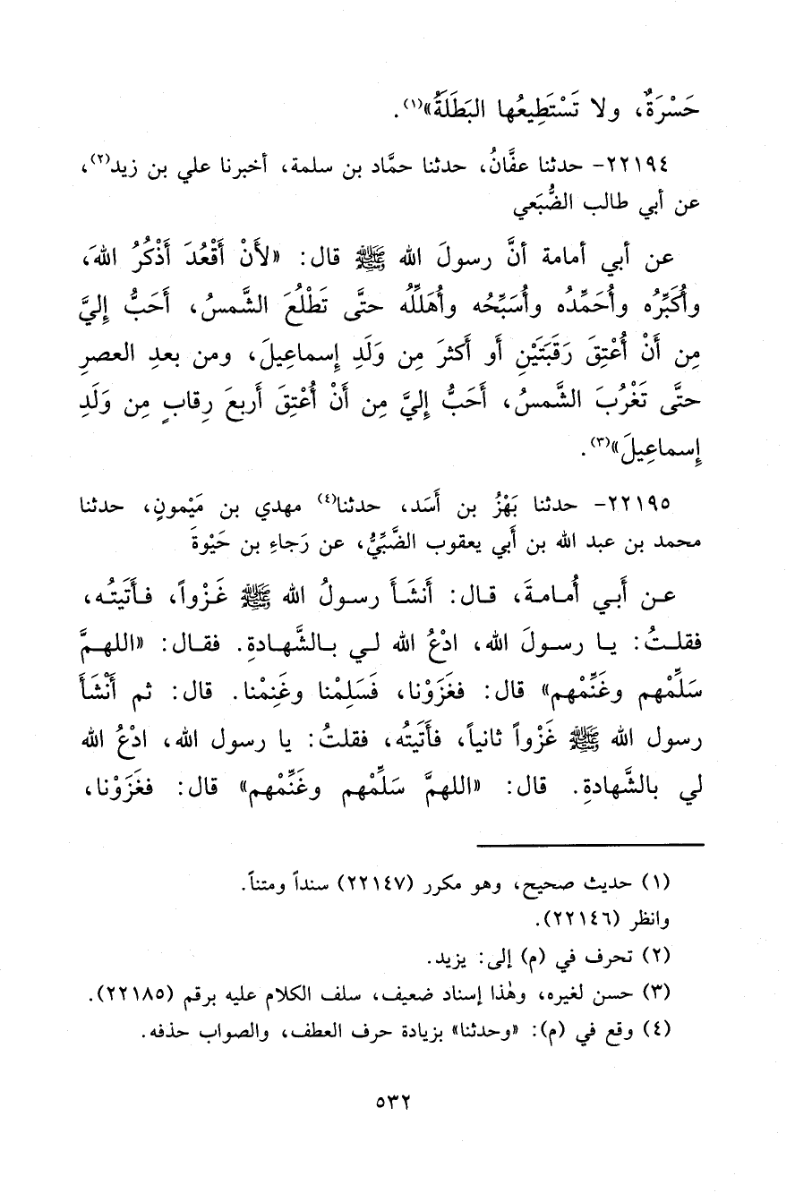 ٢٢١٩٤ - حَدَّثَنَا عَفَّانُ، حَدَّثَنَا حَمَّادُ بْنُ سَلَمَةَ، أَخْبَرَنَا عَلِيُّ بْنُ زَيْدٍ، (٢) عَنْ أَبِي طَالِبٍ الضُّبَعِيِّ، عَنْ أَبِي أُمَامَةَ، أَنَّ رَسُولَ اللهِ صَلَّى اللهُ عَلَيْهِ وَسَلَّمَ قَالَ: " لَأَنْ أَقْعُدَ أَذْكُرُ اللهَ وَأُكَبِّرُهُ وَأَحْمَدُهُ وَأُسَبِّحُهُ وَأُهَلِّلُهُ حَتَّى تَطْلُعَ الشَّمْسُ أَحَبُّ إِلَيَّ مِنْ أَنْ أَعْتِقَ رَقَبَتَيْنِ، أَوْ أَكْثَرَ مِنْ وَلَدِ إِسْمَاعِيلَ، وَمِنْ بَعْدِ الْعَصْرِ حَتَّى تَغْرُبَ الشَّمْسُ أَحَبُّ إِلَيَّ مِنْ أَنْ أَعْتِقَ أَرْبَعَ رِقَابٍ مِنْ وَلَدِ إِسْمَاعِيلَ " (٣)