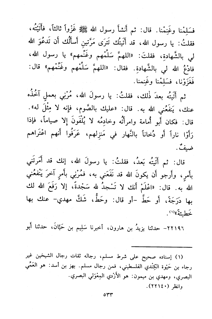 فَسَلِمْنَا وَغَنِمْنَا. قَالَ: ثُمَّ أَنْشَأَ رَسُولُ اللهِ صَلَّى اللهُ عَلَيْهِ وَسَلَّمَ غَزْوًا ثَالِثًا، فَأَتَيْتُهُ فَقُلْتُ: يَا رَسُولَ اللهِ، قَدْ أَتَيْتُكَ تَتْرَى مَرَّتَيْنِ أَسْأَلُكَ أَنْ تَدْعُوَ اللهَ لِي بِالشَّهَادَةِ. فَقُلْتَ: " اللهُمَّ سَلِّمْهُمْ وَغَنِّمْهُمْ ". يَا رَسُولَ اللهِ، فَادْعُ اللهَ لِي بِالشَّهَادَةِ. فَقَالَ: " اللهُمَّ سَلِّمْهُمْ وَغَنِّمْهُمْ ". قَالَ: فَغَزَوْنَا فَسَلِمْنَا وَغَنِمْنَا، ثُمَّ أَتَيْتُهُ بَعْدَ ذَلِكَ فَقُلْتُ: يَا رَسُولَ اللهِ، مُرْنِي بِعَمَلٍ آخُذُهُ عَنْكَ يَنْفَعُنِي اللهُ بِهِ. قَالَ: " عَلَيْكَ بِالصَّوْمِ؛ فَإِنَّهُ لَا مِثْلَ لَهُ ". قَالَ: فَكَانَ أَبُو أُمَامَةَ وَامْرَأَتُهُ وَخَادِمُهُ لَا يُلْفَوْنَ إِلَّا صِيَامًا، فَإِذَا رَأَوْا نَارًا أَوْ دُخَانًا بِالنَّهَارِ فِي مَنْزِلِهِمْ عَرَفُوا أَنَّهُمْ اعْتَرَاهُمْ ضَيْفٌ. قَالَ: ثُمَّ أَتَيْتُهُ بَعْدُ فَقُلْتُ: يَا رَسُولَ اللهِ، إِنَّكَ قَدْ أَمَرْتَنِي بِأَمْرٍ، وَأَرْجُو أَنْ يَكُونَ اللهُ قَدْ نَفَعَنِي بِهِ، فَمُرْنِي بِأَمْرٍ آخَرَ يَنْفَعُنِي اللهُ بِهِ قَالَ: " اعْلَمْ أَنَّكَ لَا تَسْجُدُ لِلَّهِ سَجْدَةً إِلَّا رَفَعَ اللهُ لَكَ بِهَا دَرَجَةً أَوْ حَطَّ،، أَوْ قَالَ: وَحَطَّ شَكَّ مَهْدِيٌّ، عَنْكَ بِهَا خَطِيئَةً " (١)