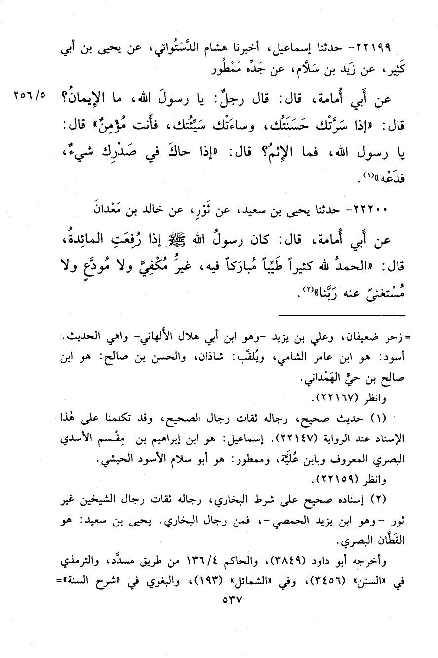٢٢١٩٩ - حَدَّثَنَا إِسْمَاعِيلُ، أَخْبَرَنَا هِشَامٌ الدَّسْتُوَائِيُّ، عَنْ يَحْيَى بْنِ أَبِي كَثِيرٍ، عَنْ زَيْدِ بْنِ سَلَّامٍ، عَنْ جَدِّهِ مَمْطُورٍ، عَنْ أَبِي أُمَامَةَ قَالَ: قَالَ رَجُلٌ: يَا رَسُولَ اللهِ مَا الْإِيمَانُ؟ قَالَ: " إِذَا سَرَّتْكَ حَسَنَتُكَ وَسَاءَتْكَ سَيِّئَتُكَ فَأَنْتَ مُؤْمِنٌ ". قَالَ: يَا رَسُولَ اللهِ، فَمَا الْإِثْمُ؟ قَالَ: " إِذَا حَاكَ فِي صَدْرِكَ شَيْءٌ فَدَعْهُ " (١)