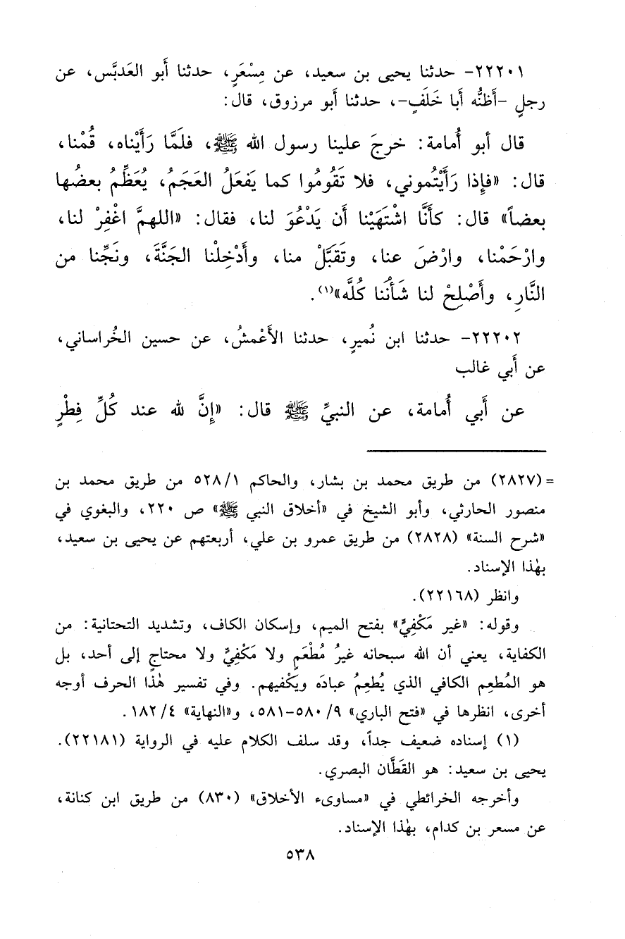 ٢٢٢٠١ - حَدَّثَنَا يَحْيَى بْنُ سَعِيدٍ، عَنْ مِسْعَرٍ، حَدَّثَنَا أَبُو الْعَدَبَّسِ، عَنْ رَجُلٍ أَظُنُّهُ أَبَا خَلَفٍ، حَدَّثَنَا أَبُو مَرْزُوقٍ قَالَ: قَالَ أَبُو أُمَامَةَ: خَرَجَ عَلَيْنَا رَسُولُ اللهِ صَلَّى اللهُ عَلَيْهِ وَسَلَّمَ فَلَمَّا رَأَيْنَاهُ قُمْنَا قَالَ: " فَإِذَا رَأَيْتُمُونِي فَلَا تَقُومُوا كَمَا يَفْعَلُ الْعَجَمُ يُعَظِّمُ بَعْضُهَا بَعْضًا ". قَالَ: كَأَنَّا اشْتَهَيْنَا أَنْ يَدْعُوَ لَنَا فَقَالَ: " اللهُمَّ اغْفِرْ لَنَا وَارْحَمْنَا، وَارْضَ عَنَّا، وَتَقَبَّلْ مِنَّا وَأَدْخِلْنَا الْجَنَّةَ، وَنَجِّنَا مِنَ النَّارِ، وَأَصْلِحْ لَنَا شَأْنَنَا كُلَّهُ " (١)