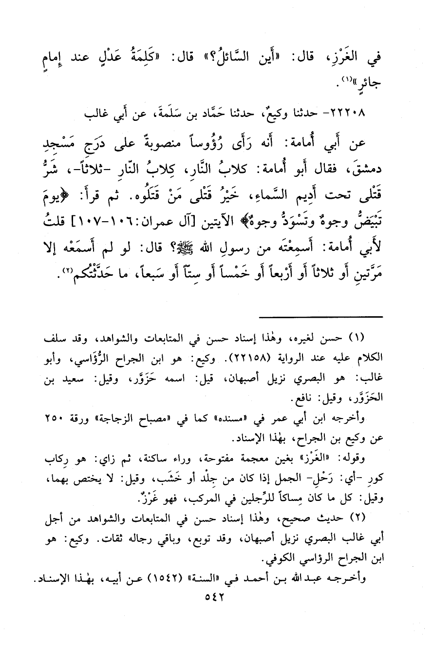 ٢٢٢٠٨ - حَدَّثَنَا وَكِيعٌ، حَدَّثَنَا حَمَّادُ بْنُ سَلَمَةَ، عَنْ أَبِي غَالِبٍ، عَنْ أَبِي أُمَامَةَ، أَنُهْ رَأَى رُءُوسًا مَنْصُوبَةً عَلَى دَرَجِ مَسْجِدِ دِمَشْقَ فَقَالَ أَبُو أُمَامَةَ: " كِلَابُ النَّارِ كِلَابُ النَّارِ، ثَلَاثًا، شَرُّ قَتْلَى تَحْتَ أَدِيمِ السَّمَاءِ. خَيْرُ قَتْلَى مَنْ قَتَلُوهُ، ثُمَّ قَرَأَ {يَوْمَ تَبْيَضُّ وُجُوهٌ وَتَسْوَدُّ وُجُوهٌ} [آل عمران: ١٠٦] ". ١٠ قُلْتُ لِأَبِي أُمَامَةَ أَسَمِعْتَهُ مِنْ رَسُولِ اللهِ صَلَّى اللهُ عَلَيْهِ وَسَلَّمَ؟ قَالَ: لَوْ لَمْ أَسْمَعْهُ إِلَّا مَرَّتَيْنِ أَوْ ثَلَاثًا أَوْ أَرْبَعًا أَوْ خَمْسًا أَوْ سِتًّا أَوْ سَبْعًا مَا حَدَّثْتُكُمْ (٢)