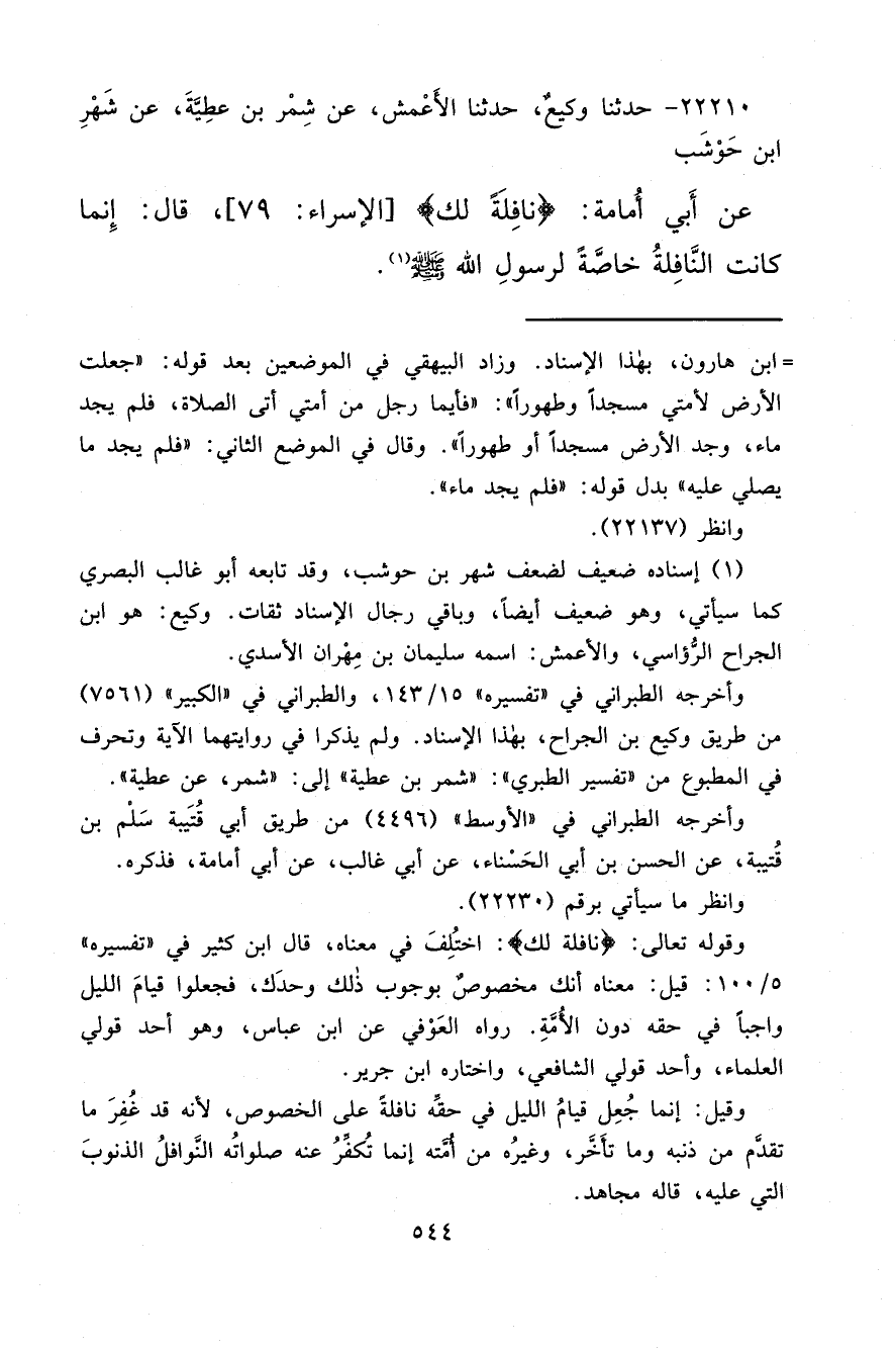 ٢٢٢١٠ - حَدَّثَنَا وَكِيعٌ، حَدَّثَنَا الْأَعْمَشُ، عَنْ شِمْرِ بْنِ عَطِيَّةَ، عَنْ شَهْرِ بْنِ حَوْشَبٍ، عَنْ أَبِي أُمَامَةَ، " {نَافِلَةً لَكَ} [الإسراء: ٧٩] قَالَ: إِنَّمَا كَانَتِ النَّافِلَةُ خَاصَّةً لِرَسُولِ اللهِ صَلَّى اللهُ عَلَيْهِ وَسَلَّمَ " (١)